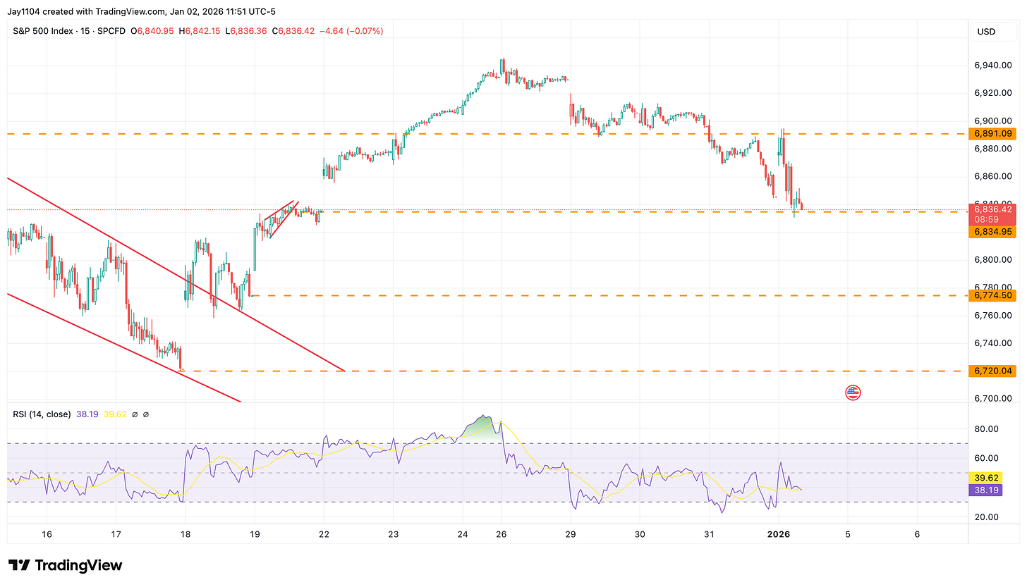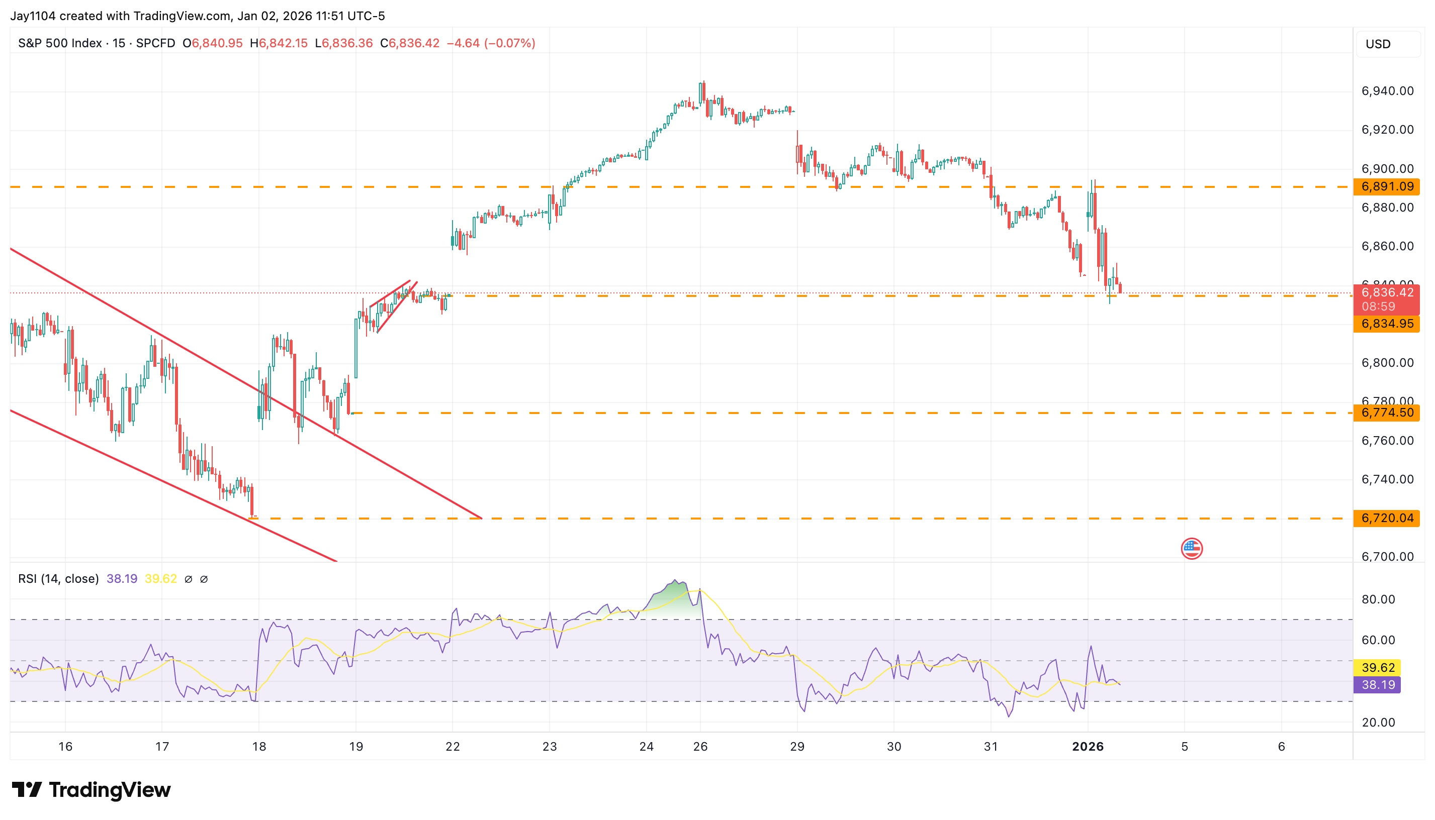 The S&P 500 is currently testing gap support near 6,834, created on December 19. This level coincides closely with the 50-day moving average near 6,800. If this area fails to hold, the index would likely begin to probe lower gap zones near 6,775 and potentially 6,725, which would place prices back into mid-December ranges. Holding this support would help stabilize price action, but it would not, on its own, resolve broader volatility pressures.