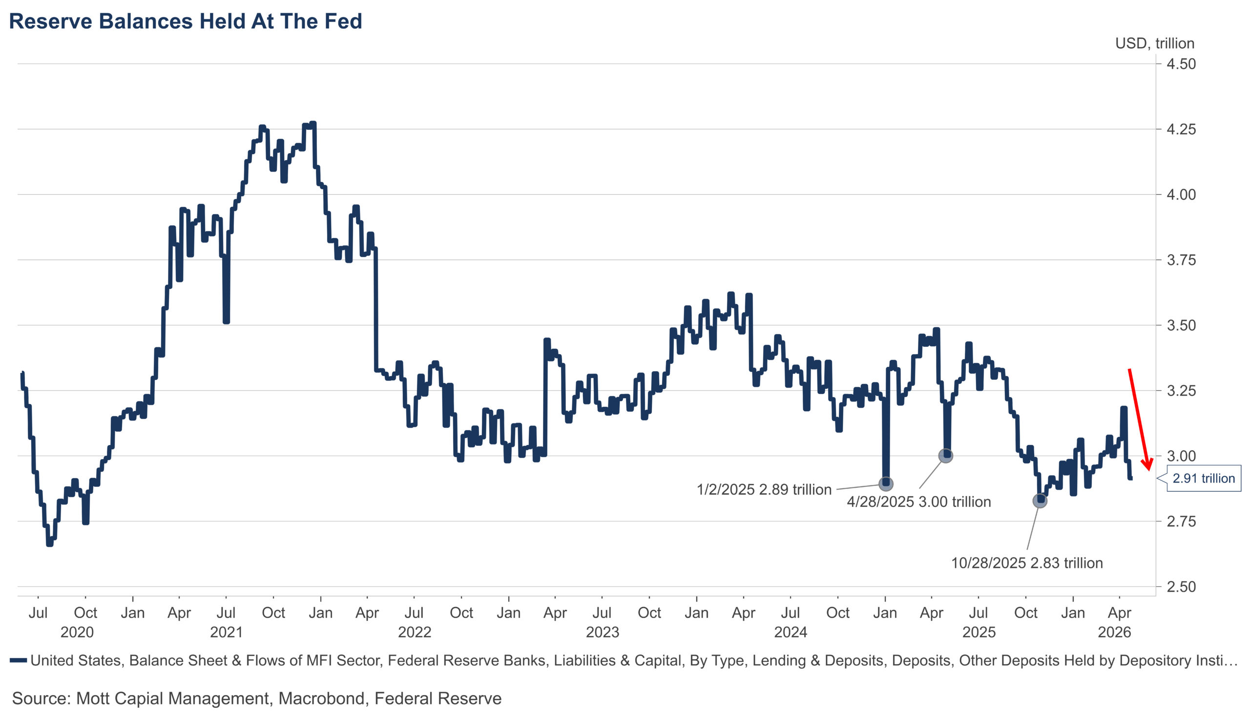 If these trends continue, financial conditions are likely to tighten again, which would be unsupportive of risk assets. What makes matters worse is that this is happening at a time when reserve balances have fallen to around $2.9 trillion — their lowest level since the end of 2025. In essence, that suggests liquidity is thin at best, at least for now.