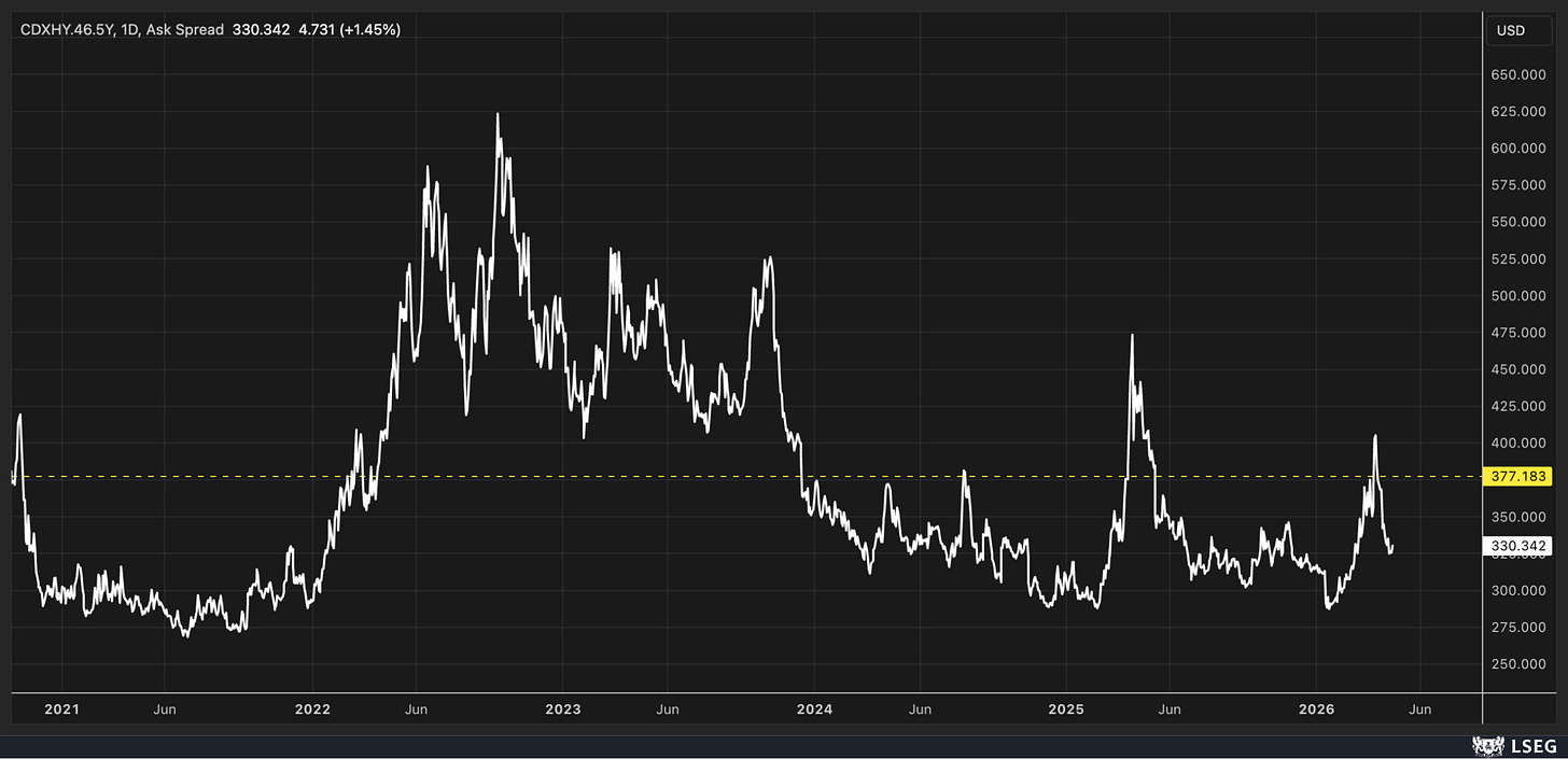 This is now causing credit spreads to widen again. The CDX HY Credit Spread Index moved out to roughly 331 today. While that level is still low, what matters is that, after falling sharply, it has stopped tightening. If the index begins to form higher lows from here, that would be meaningful going forward.