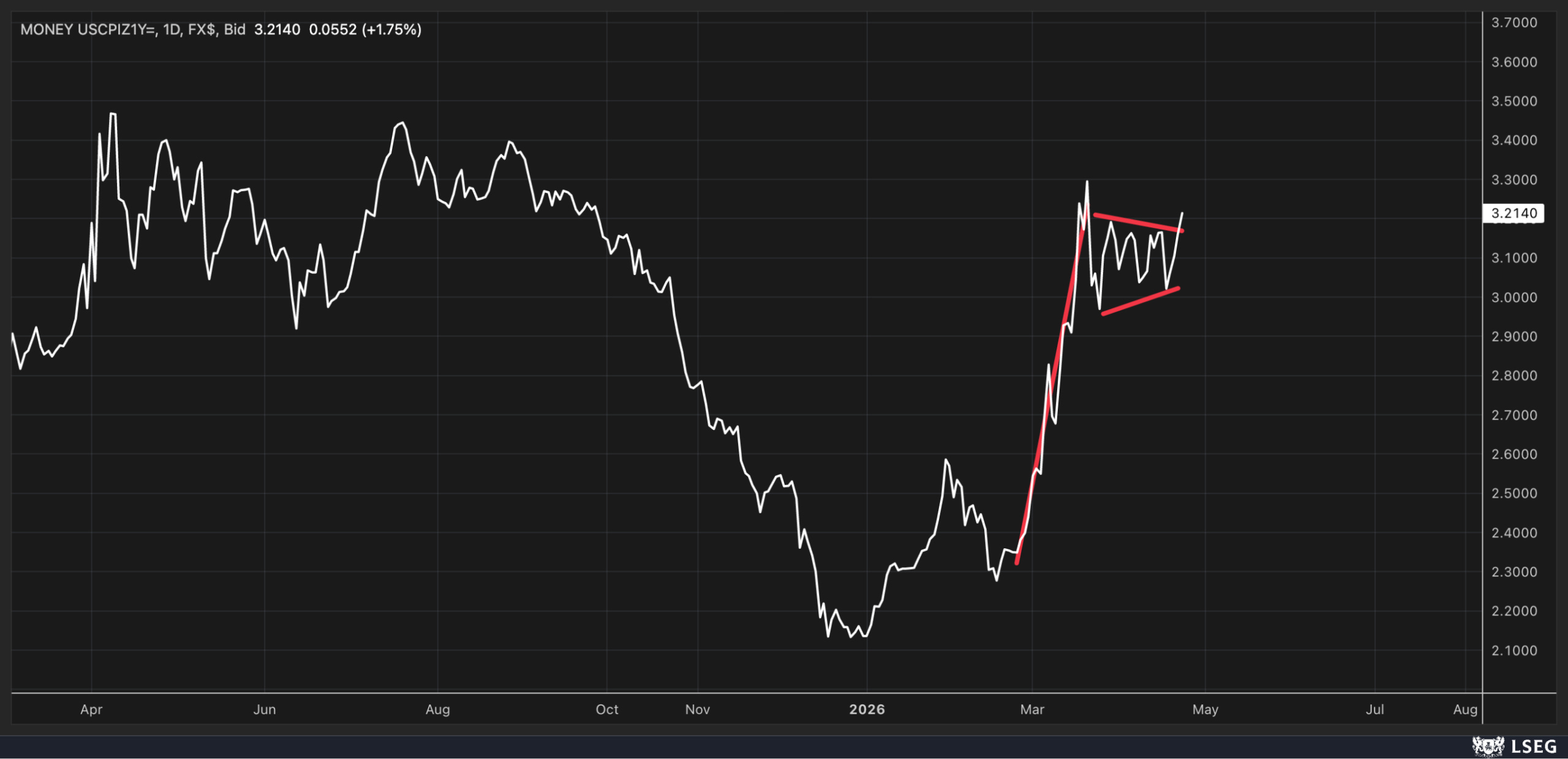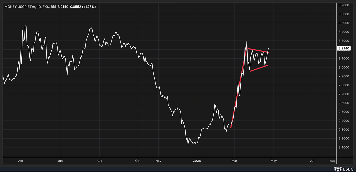 Additionally, today we saw 1-year inflation swaps rise and break out of a pennant pattern, suggesting potential upside. If sustained, this could indicate that inflation expectations are set to increase in a more meaningful way.