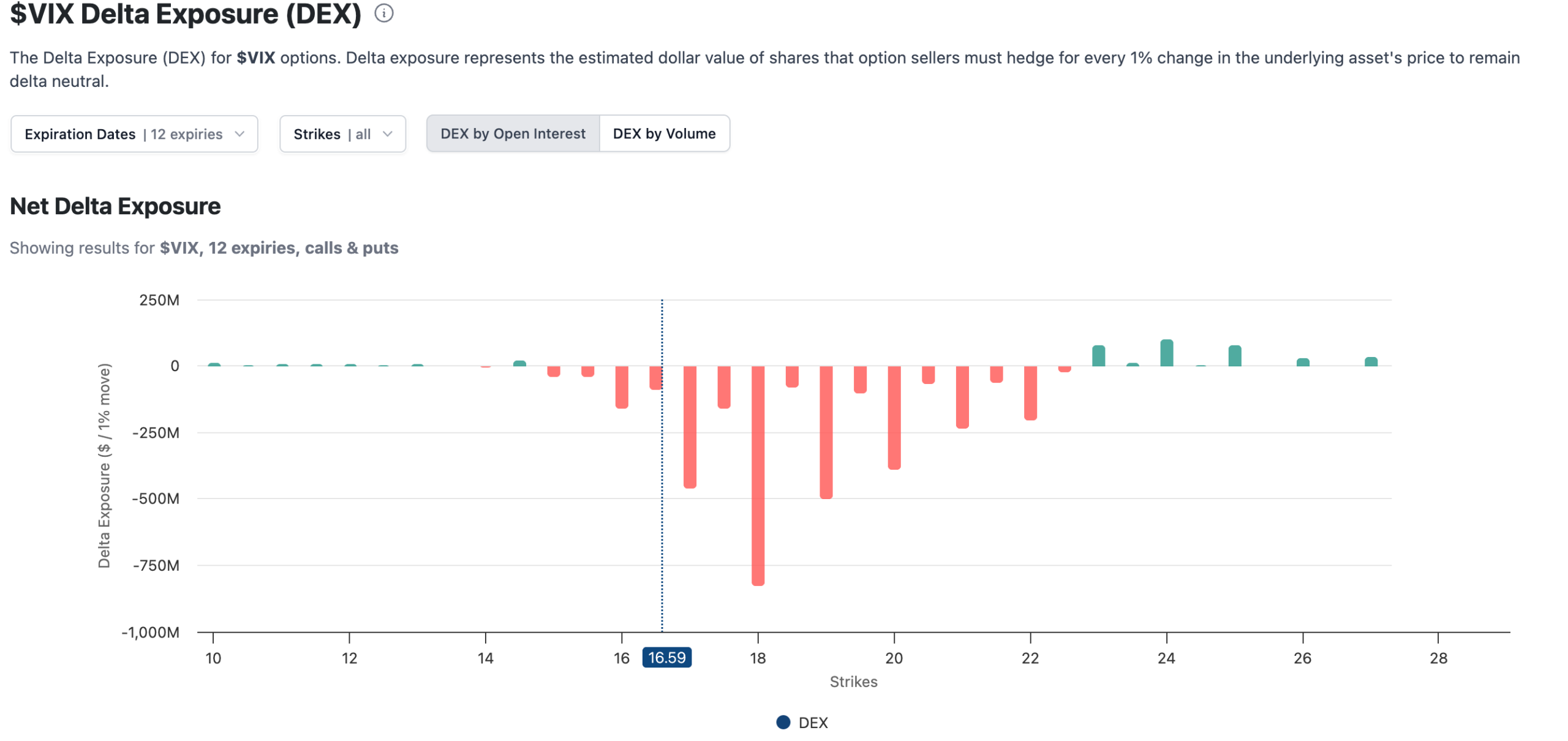 Additionally, VIX options appear to be positioned in a way that keeps the index sticky around 16. Below that level, delta values flatten out, which means the hedging dynamics that normally push the VIX around are no longer present. As a result, those mechanical forces are likely to fade, keeping volatility pinned and putting a lid on the S&P 500.