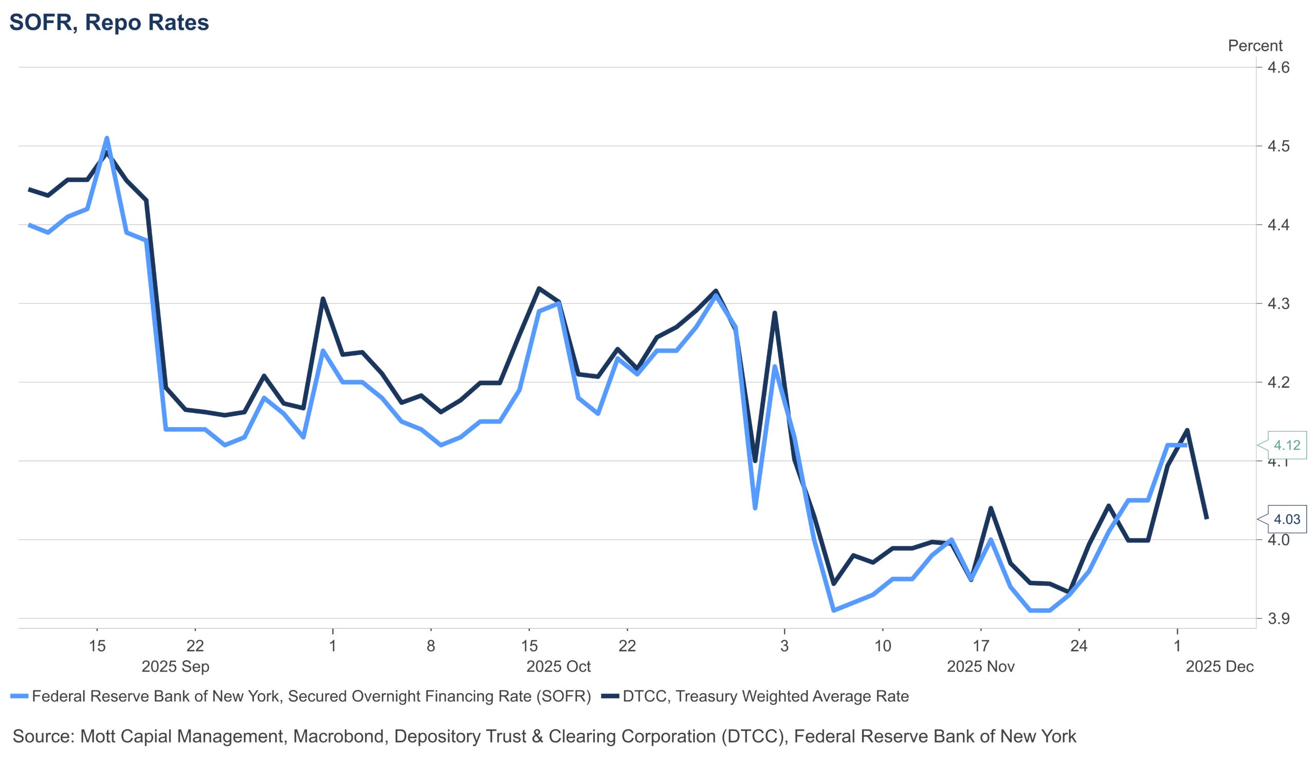 Today was a settlement day, and, more importantly, it was a net paydown of about $11 billion, which, in theory, should add liquidity back into the system. This helped general collateral rates fall to 4.03%, which should mean that SOFR drops tomorrow morning sharply from the 4.12% reported today. With another net paydown of $7 billion coming on Thursday, overnight funding pressures should continue to ease — the only question is by how much.