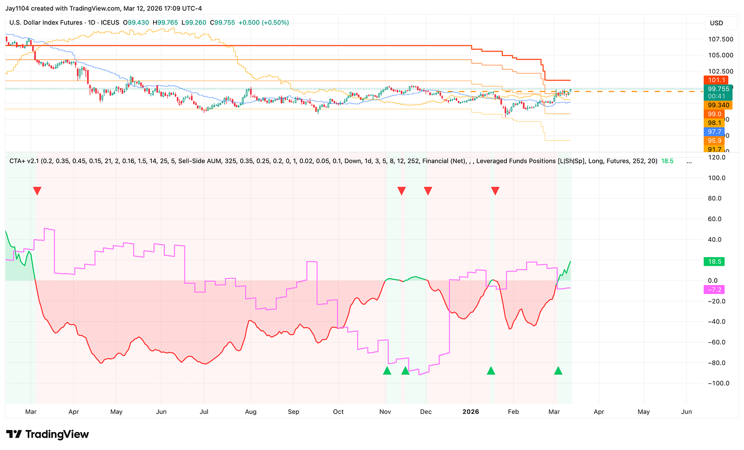 Meanwhile, today the dollar index futures rose above what appears to be resistance at 99.75, and it could very well be the case that systematic flows have already flipped from short to long, which may only add to the recent strength in the dollar. Certainly, just looking at the technical chart would suggest the dollar may have further to climb.