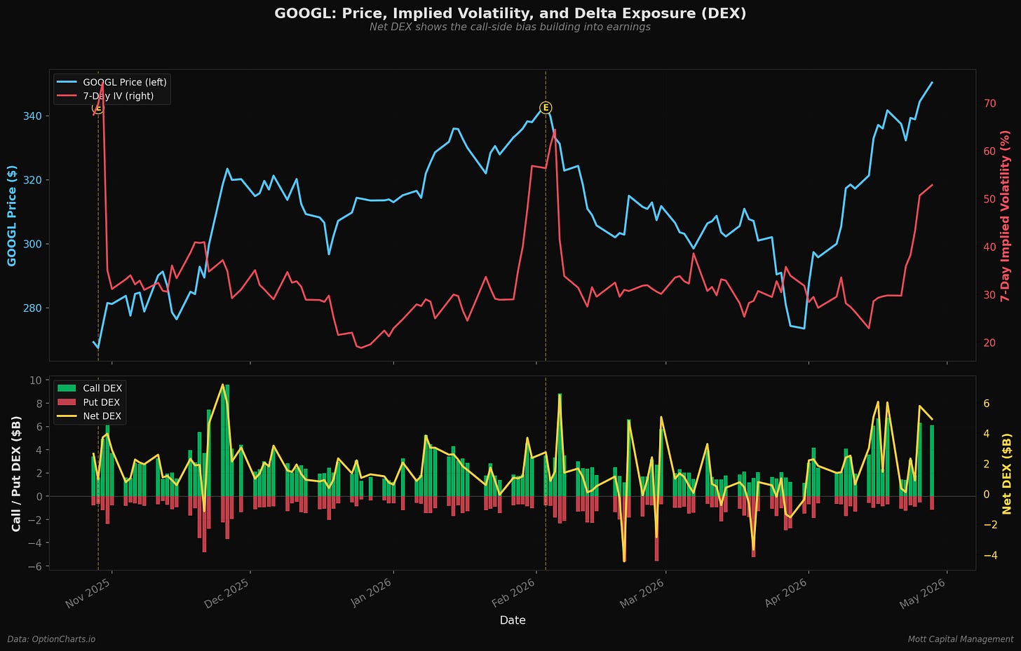 You can make the same argument with Alphabet, where implied volatility is rising alongside heavy call volumes. Microsoft shows the same pattern as well. Across the board, the message is consistent: this is positioning, not hedging.