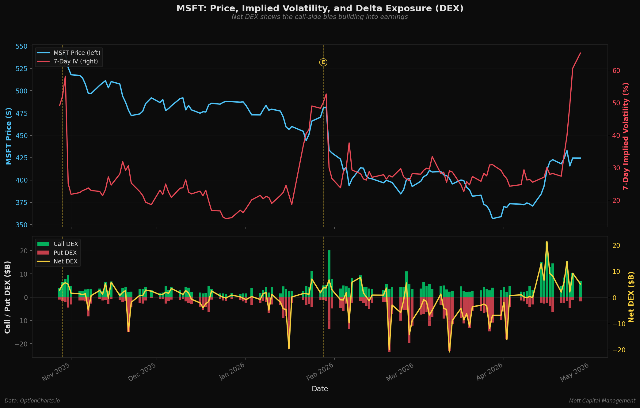 There is no real difference with Microsoft either. The same dynamics are in place—rising implied volatility and call-driven activity—which again suggests this is being driven by positioning, not fear.