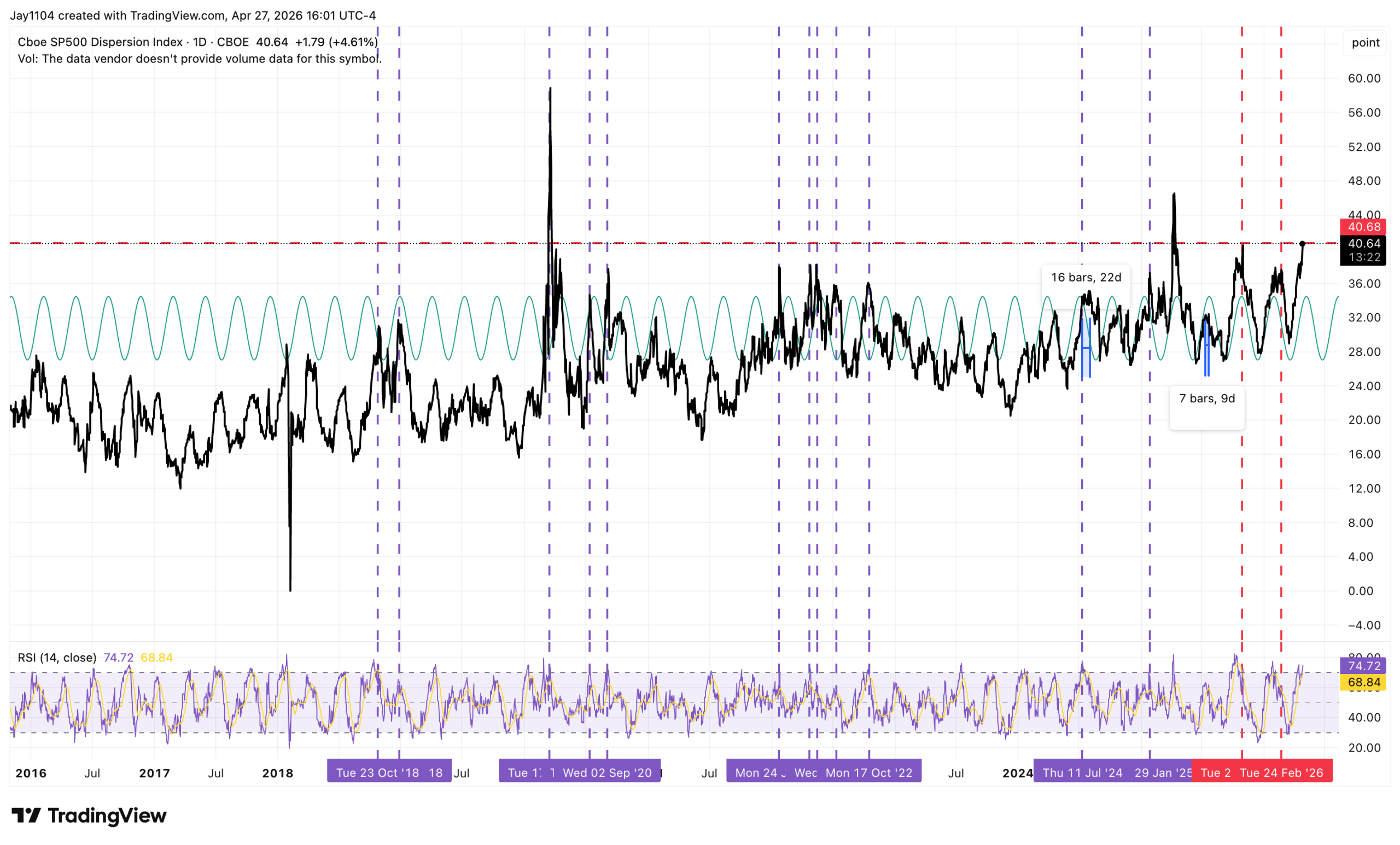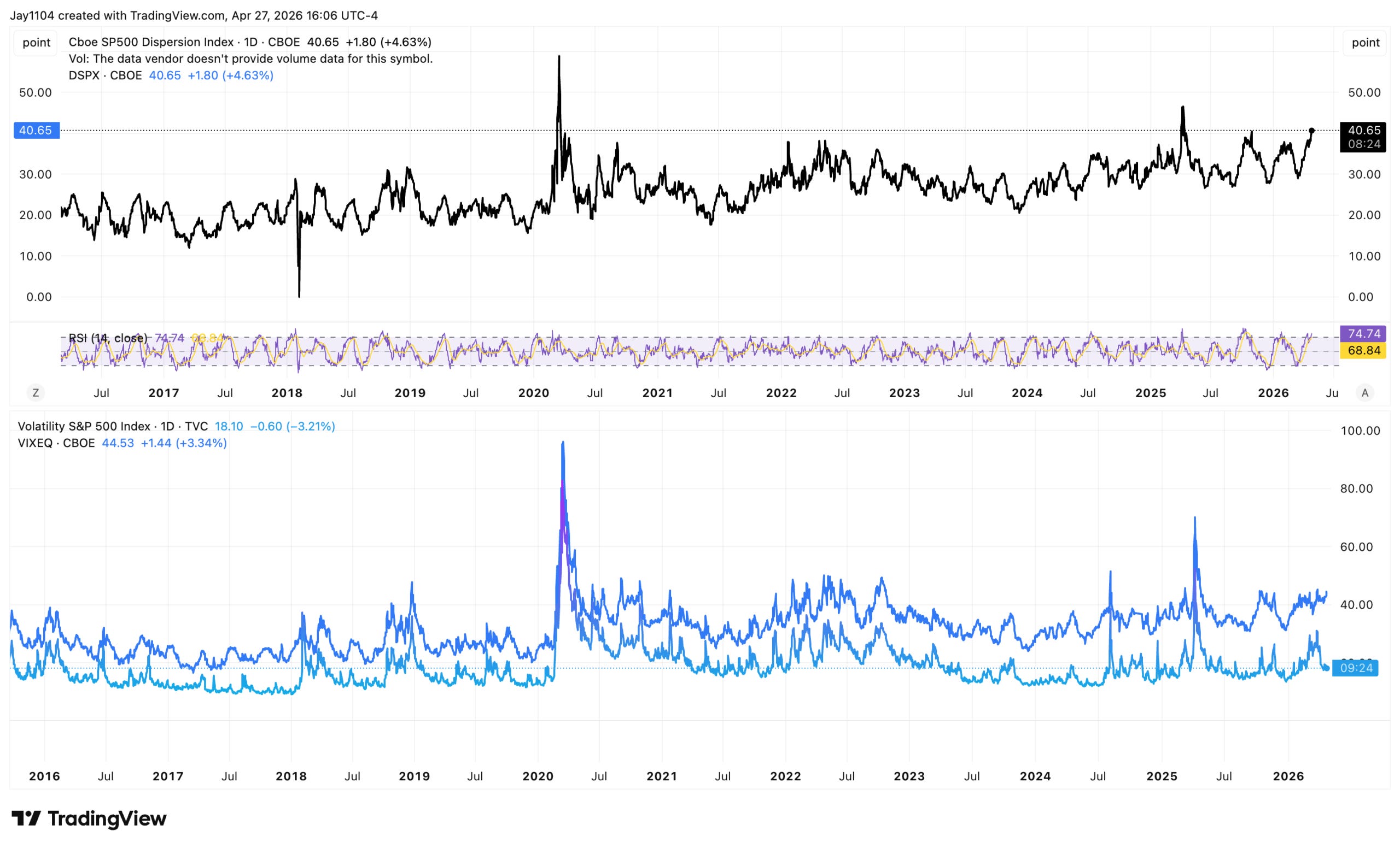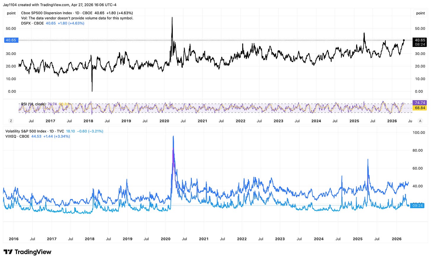 Dispersion To The Max. When the S&P 500 dispersion index trades above 40, it is entering rare territory—levels previously seen during the COVID meltdown in March 2020 and the Tariff Tantrum in 2025. The DSPX has now pushed beyond its October 2025 highs, underscoring just how extreme conditions have become.