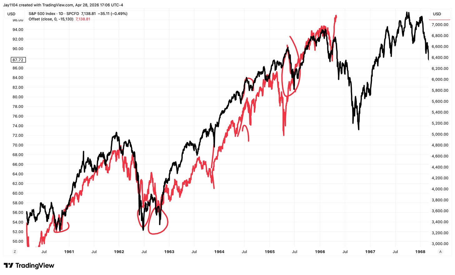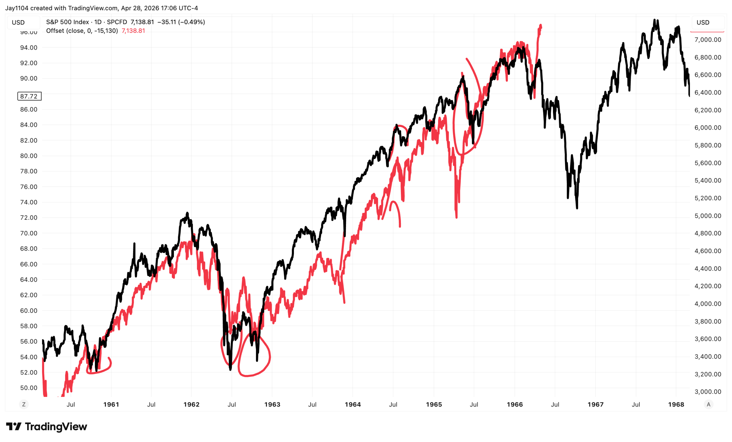 Finally, tonight, I just wanted to note that the fate of the 1966 analog rests on what transpires over the next few trading days. The chart suggests a turn lower is due, and that should mark the beginning of something more severe than what we have experienced so far. The recent move higher was greater than the analog suggested, but again, this is more about the twists and turns than the levels.