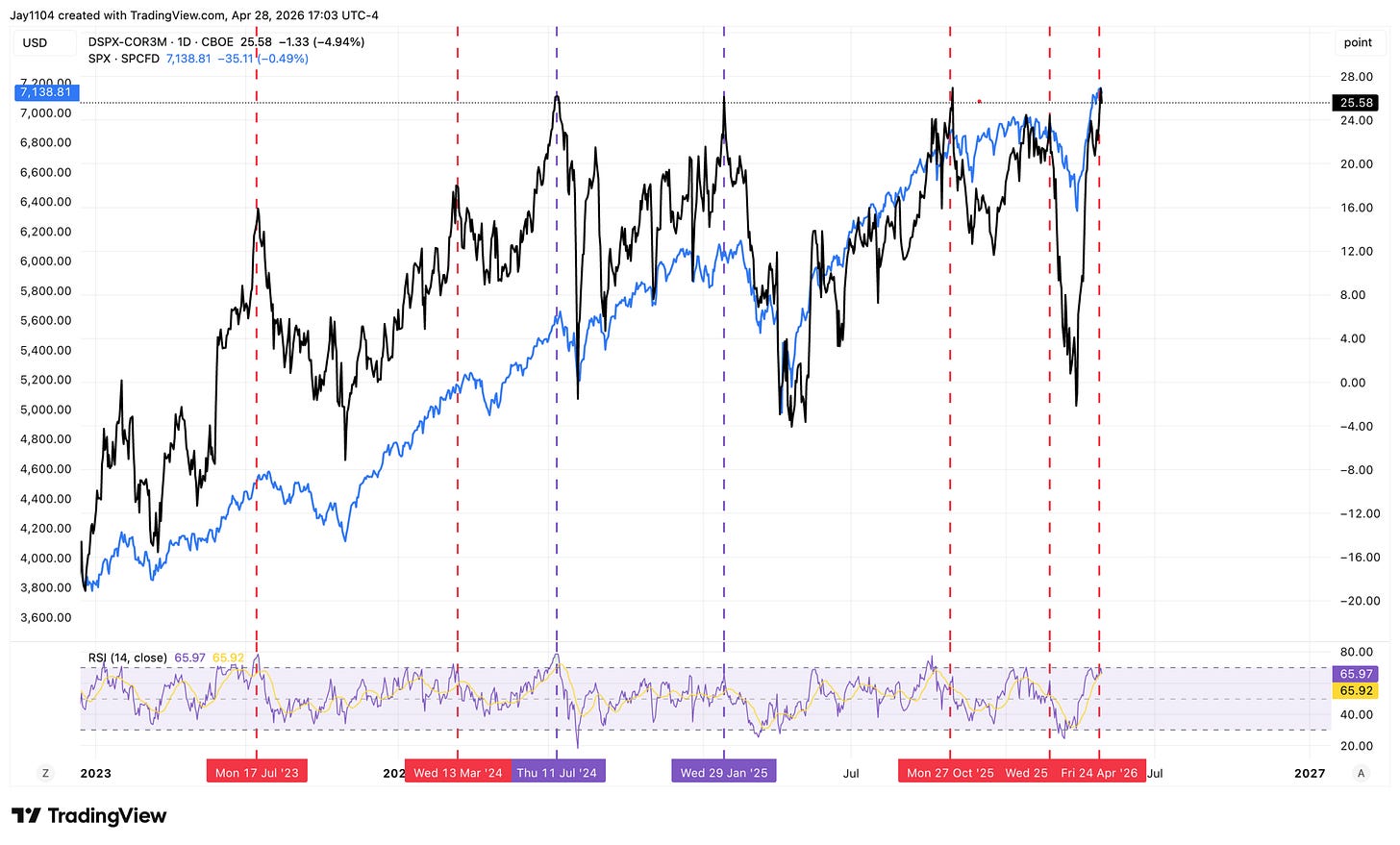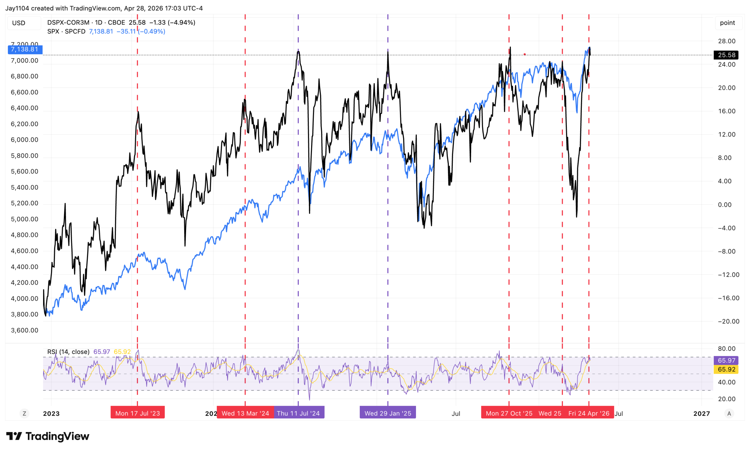 Tomorrow is the FOMC meeting, and we will get earnings from four of the Mag 7. The dispersion trade—and the index—are living on borrowed time. The dispersion index fell today, closing below 40, while implied correlation rose, resulting in a compression of the spread between the two. As dispersion begins to unwind, this spread should compress further, and as it does, the S&P 500 should move lower along with it.