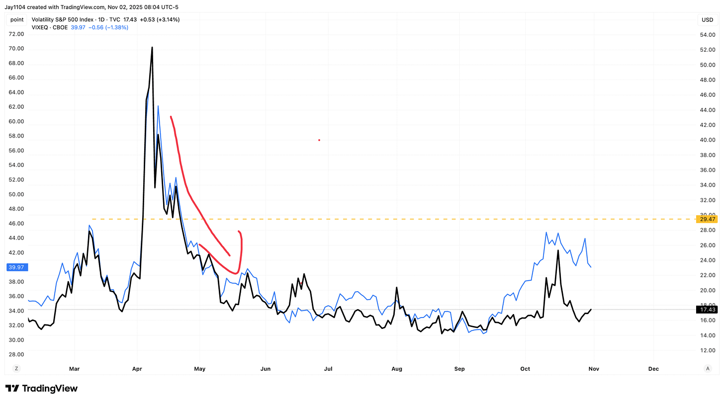 More interestingly, on Friday, the S&P 500 rose alongside implied volatility and correlations, while dispersion fell. The unusual move in the S&P 500 was largely driven by Amazon’s gain, while the rise in the VIX reflected the unwind of the dispersion trade we’ve discussed extensively, as the VIXEQ declined.