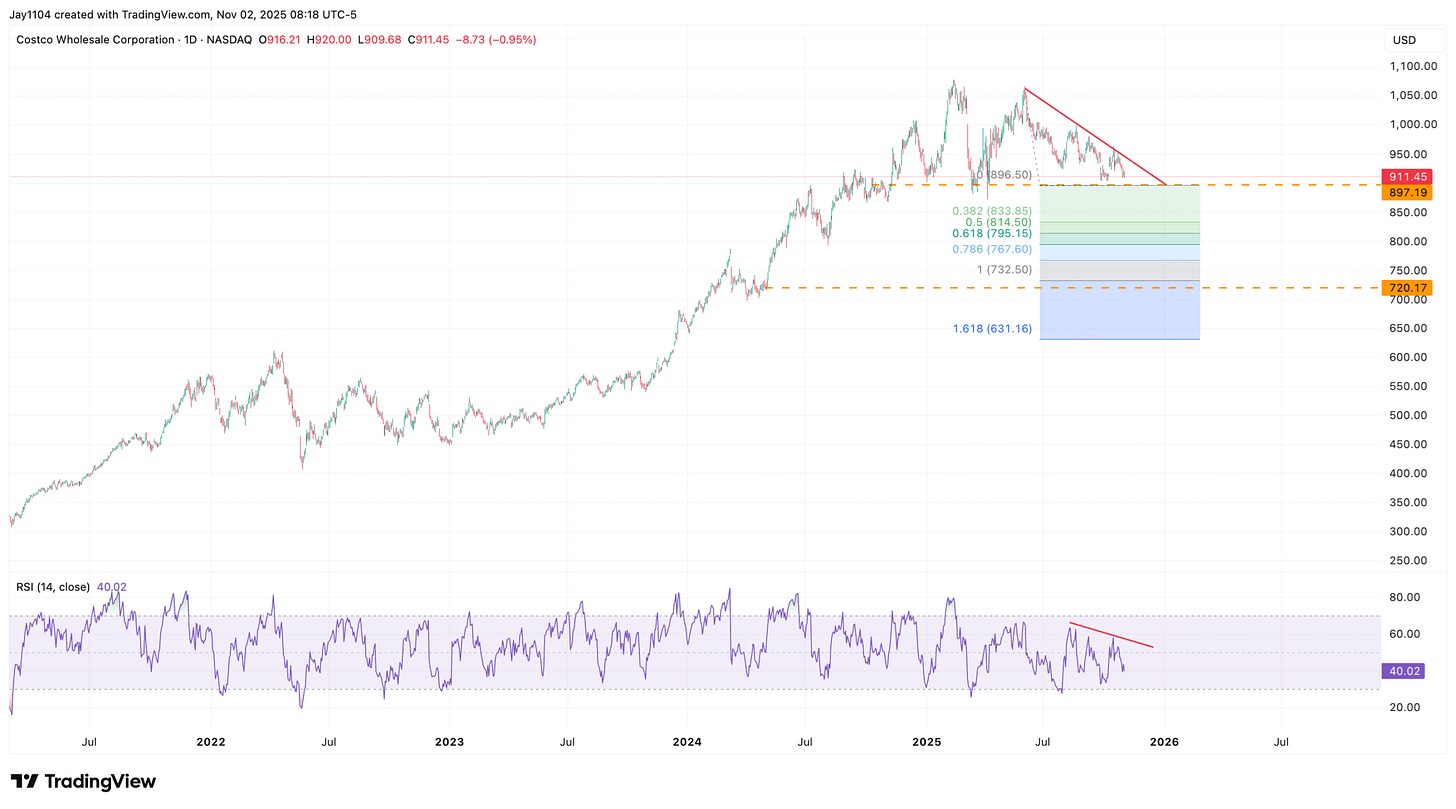 If Costco (COST) serves as a proxy for the health of the consumer, then the consumer doesn’t appear to be in good shape. COST has formed a clear descending triangle pattern, with the RSI trending lower. A break below support around $890 would be very bearish, with the potential for the stock to fall back into the low $700s when projecting the move from the top of the triangle to its base.