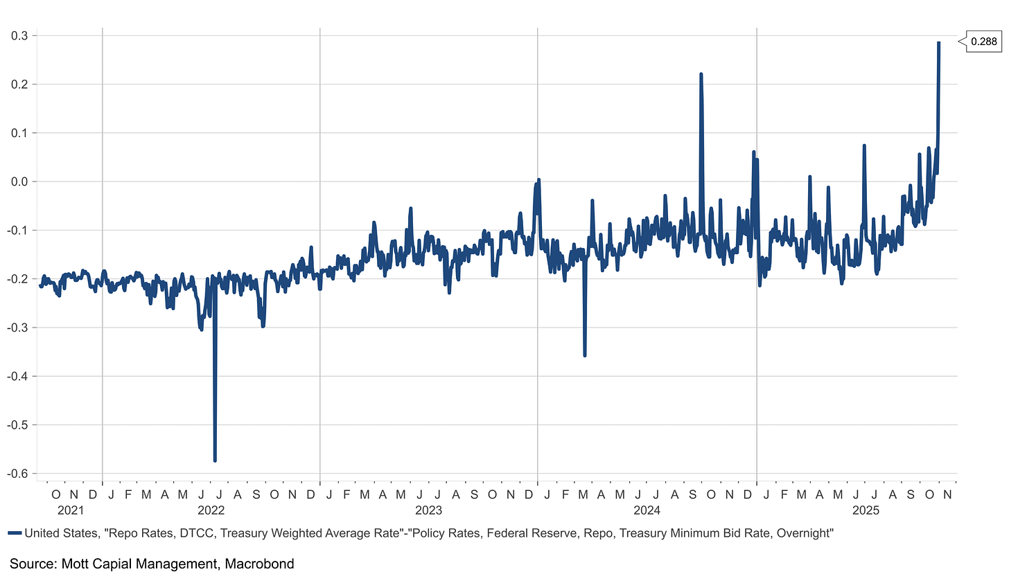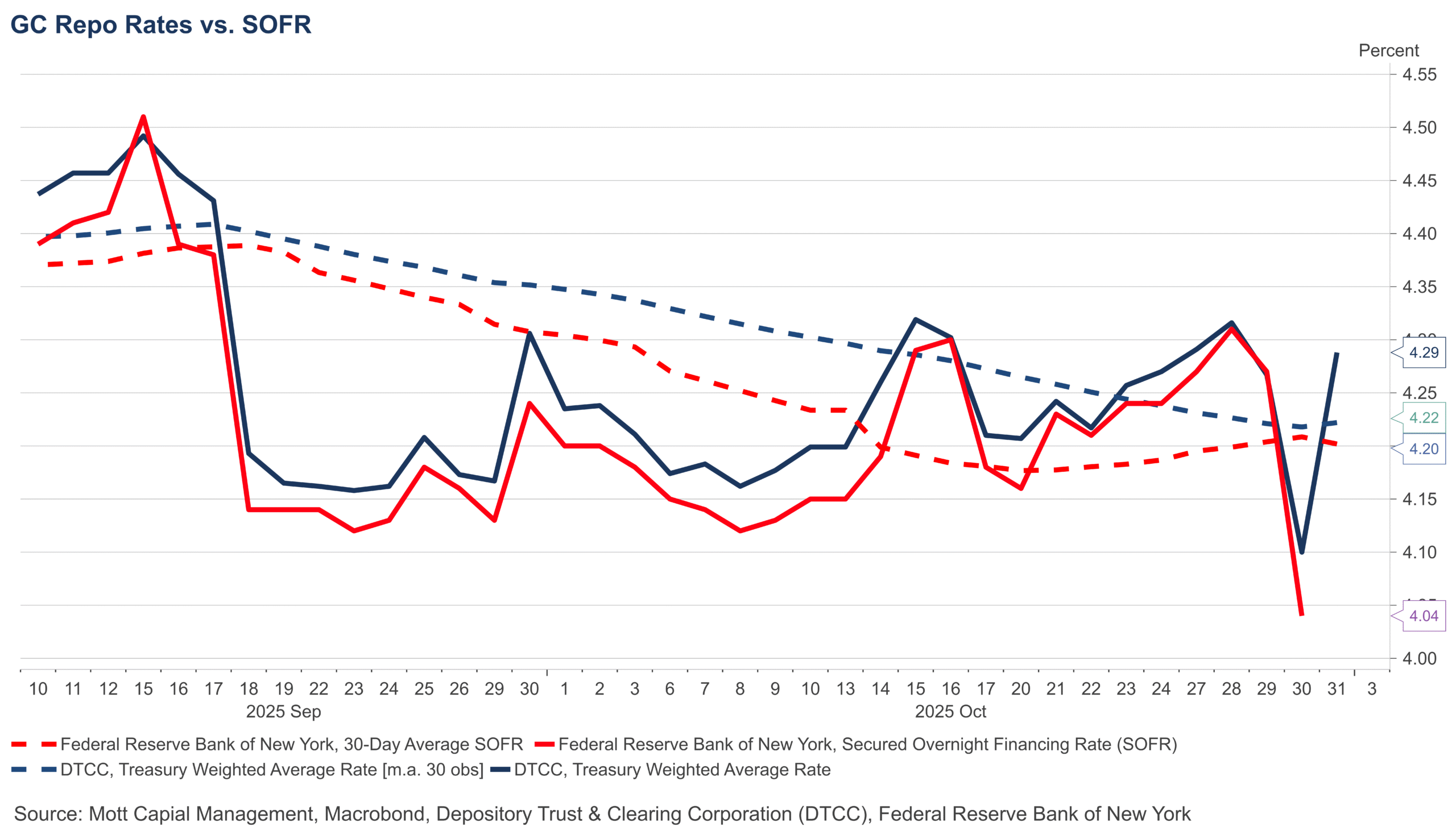 Liquidity pressures should ease somewhat this week now that we’re past month-end, and Treasury settlements are expected to total around $50 billion — roughly half of last week’s $100 billion. But “easier” is an understatement; by easier, I simply mean compared with Friday. Overall conditions are likely to remain tight, and overnight rates are expected to stay elevated for the foreseeable future.