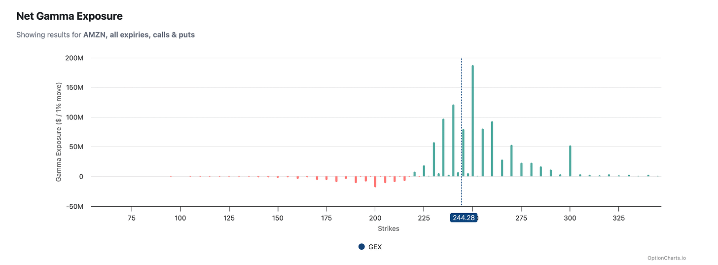 As I noted on Thursday, Amazon’s call wall at $250 proved too strong, preventing the stock from breaking through on Friday. Based on current positioning, that $250 call wall is likely to remain in place at the start of this week, leaving the stock with little room to move higher from a bullish standpoint.