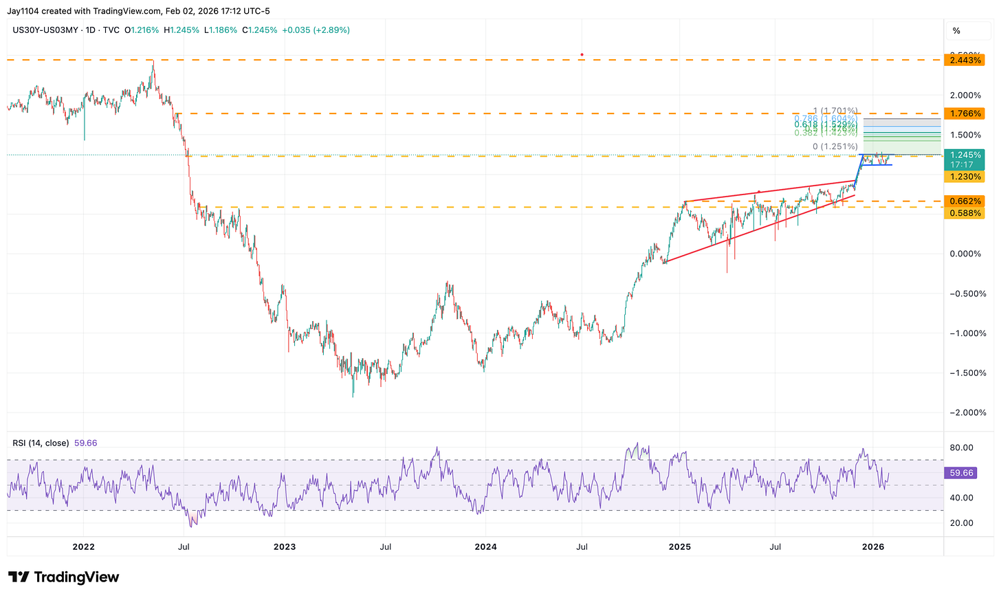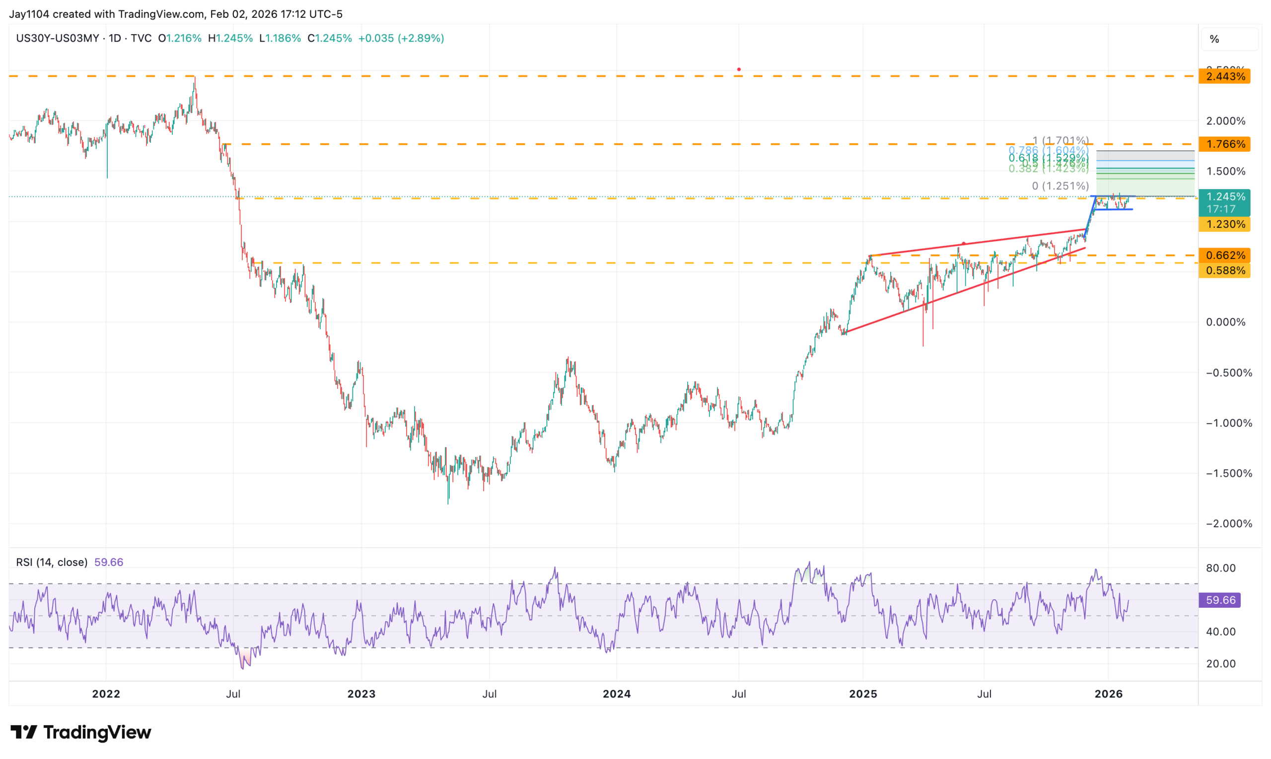 The 30-year minus 3-month spread is once again at the upper end of its bull flag pattern. At this point, if the spread can break above the 1.25% level, it could accelerate higher, with potential upside towards 1.7% to 1.75%.