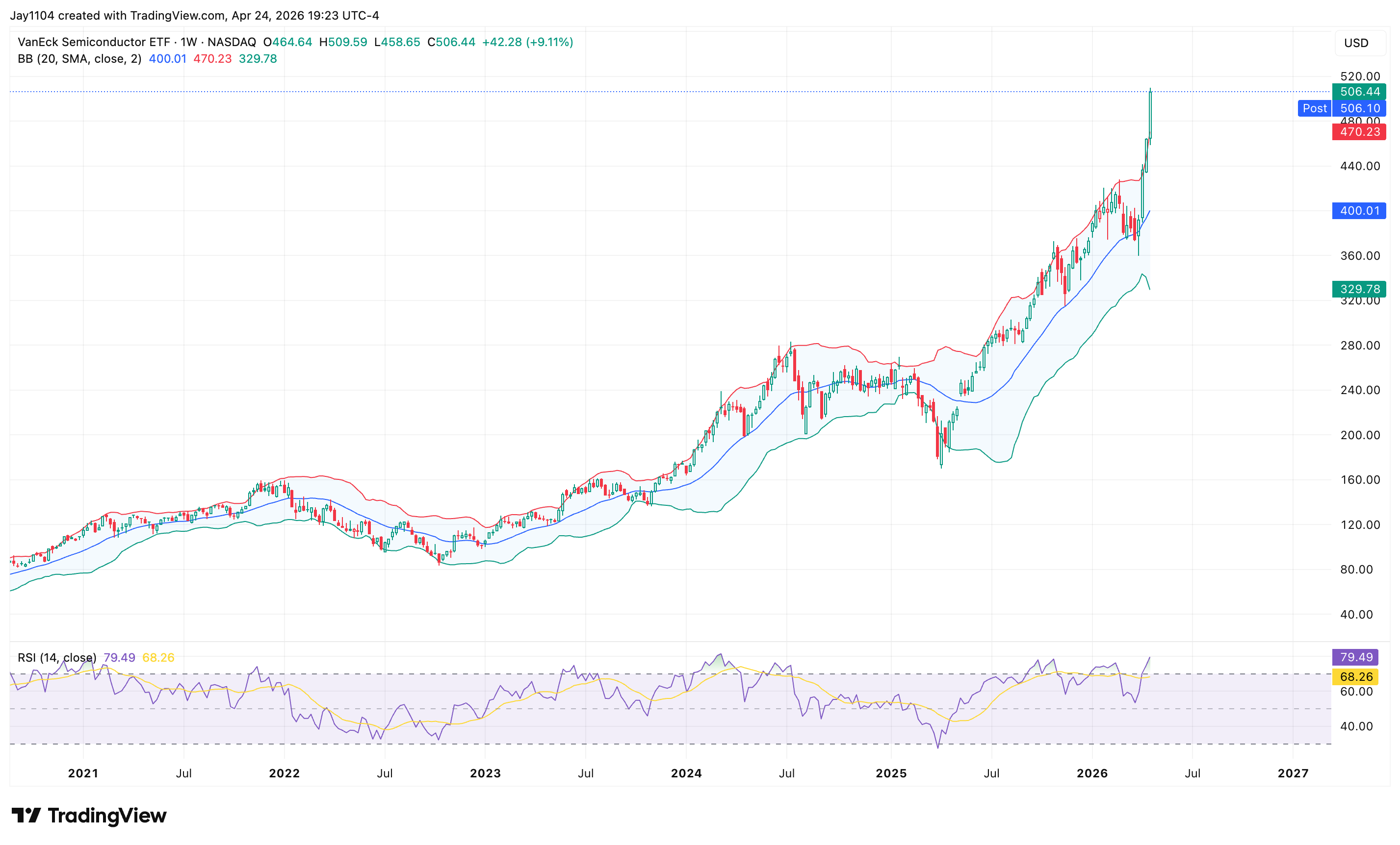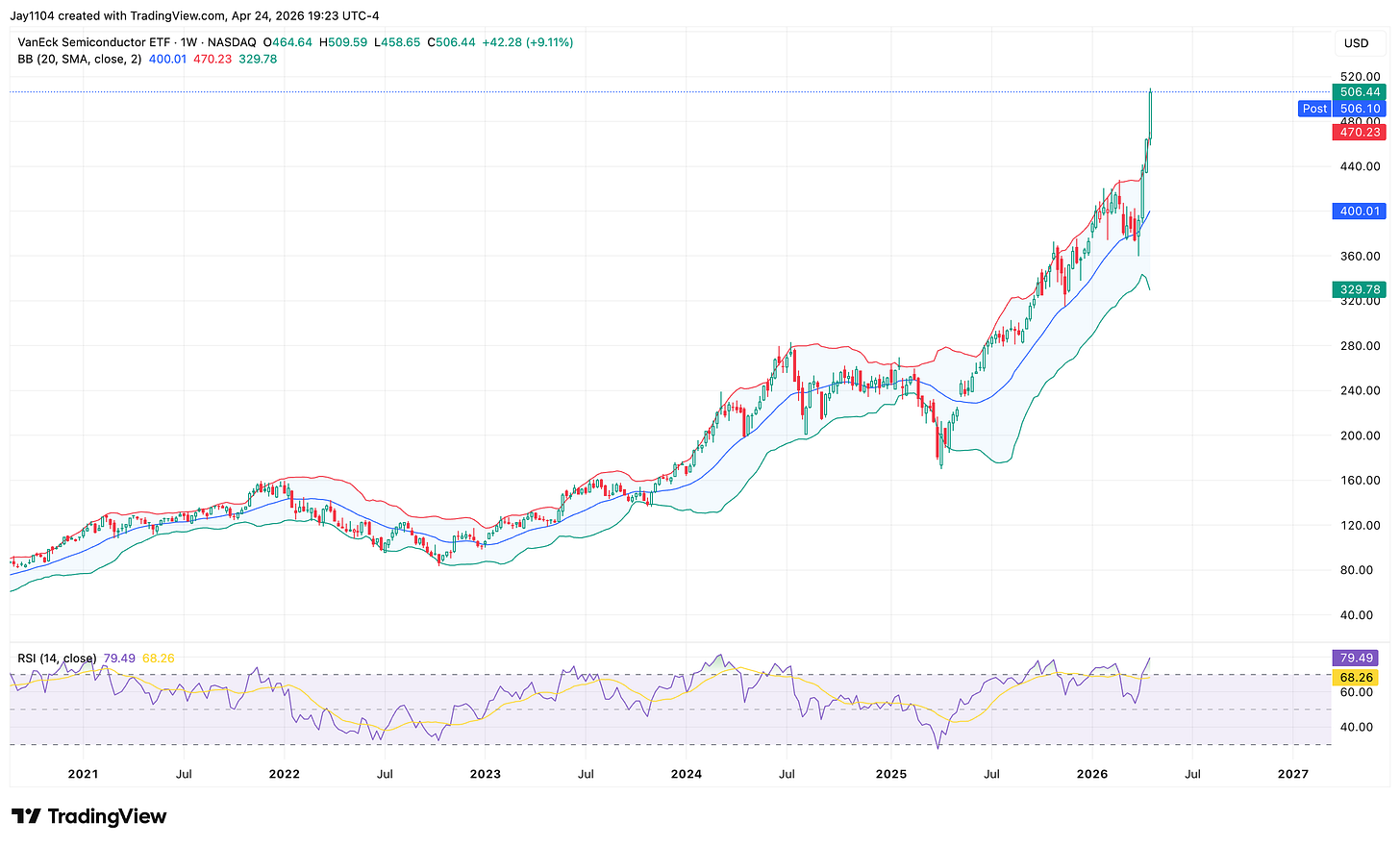 The dispersion trade — the dominant technical driver of the index for several weeks — pushed into a historically rare area, with the dispersion-minus-correlation spread breaking out to a new local high. The crowding peaks just as the calendar turns against it: Meta, Microsoft, Apple, Amazon, and Alphabet all report next week, with NVIDIA the lone holdout into mid-May. Prior analogs in October and February both saw dispersion peak into the mega-cap cluster and reverse sharply once the prints cleared. Intel broke out to an all-time high after results — a level the stock had battled for roughly 26 years — and the SMH sat overbought across weekly, monthly, and daily timeframes.