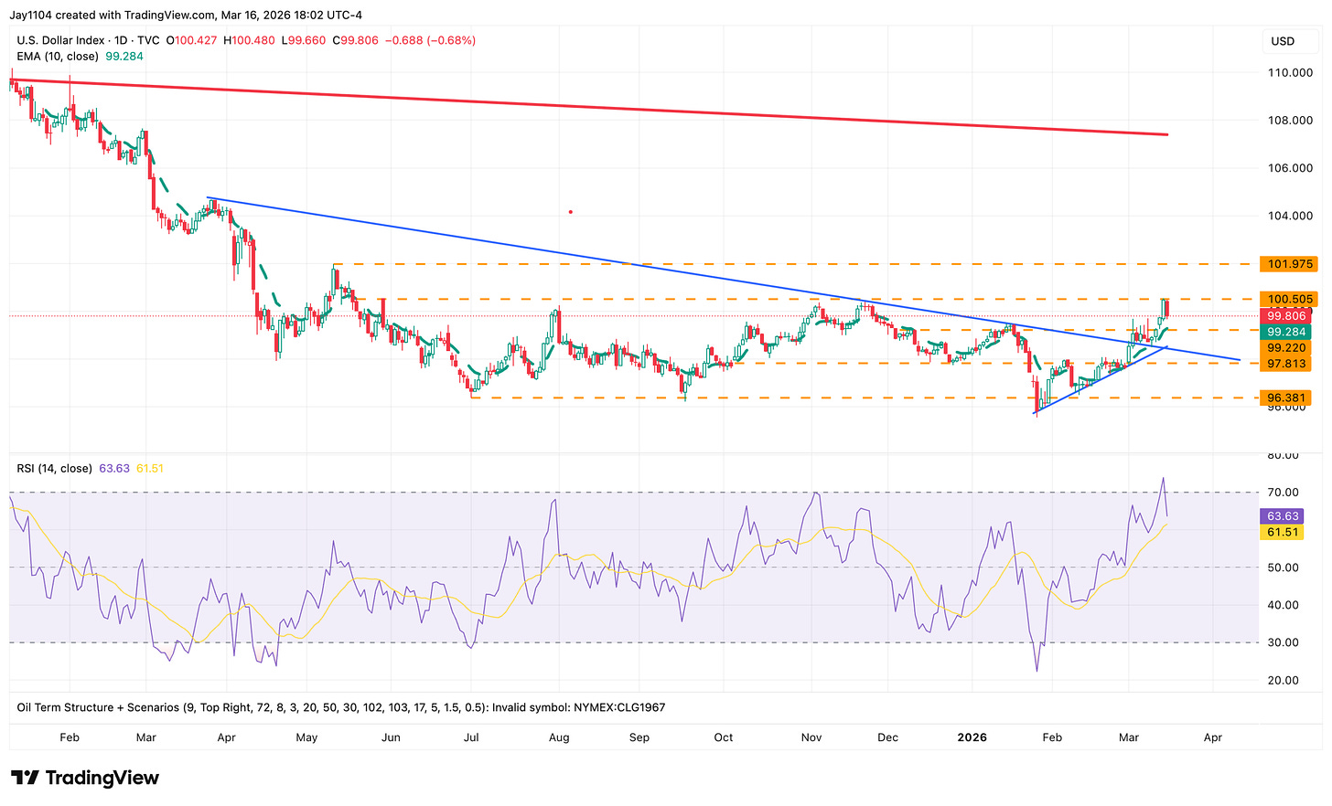 Oil fell by more than 5% on the day but remains stuck between the upper Bollinger Band and the 10-day exponential moving average. Nothing has really changed here. However, if oil continues to decline, it would be a significant positive for stocks and markets overall, as financial conditions would ease, rates would fall, and the dollar would weaken.