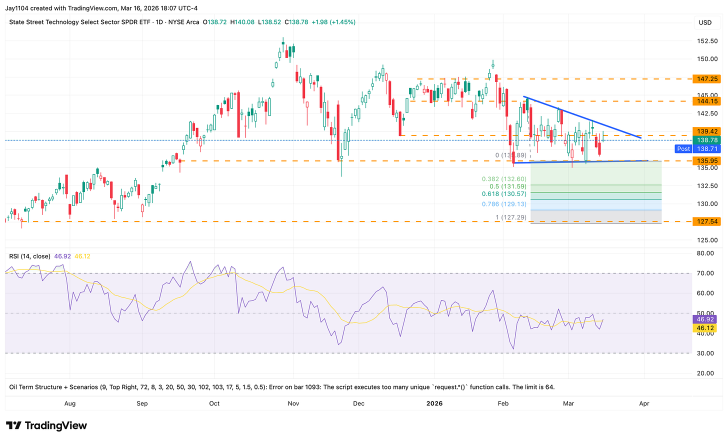 Finally, XLK is one to watch because it appears to be forming a descending triangle. A break below $138 could lead to a move down toward $127, based on a measured move from the peak of the triangle to the base. At this point, XLK would need to move above $141 to invalidate the pattern.