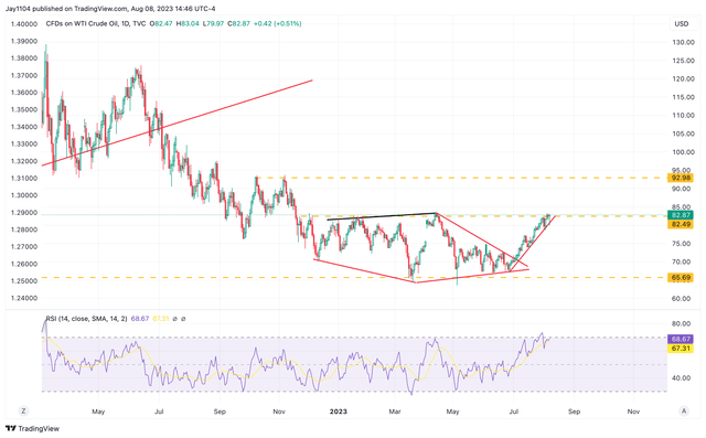 Oil rallied from $80ish at 7:30 am ET to around $83 by day's end. Oil has been unable to surpass the $83 level for months, and it seems to be making its most powerful attempt thus far to push above that price level. If that resistance level is broken, oil prices could surge into the low $90s, at least based on the technicals.
