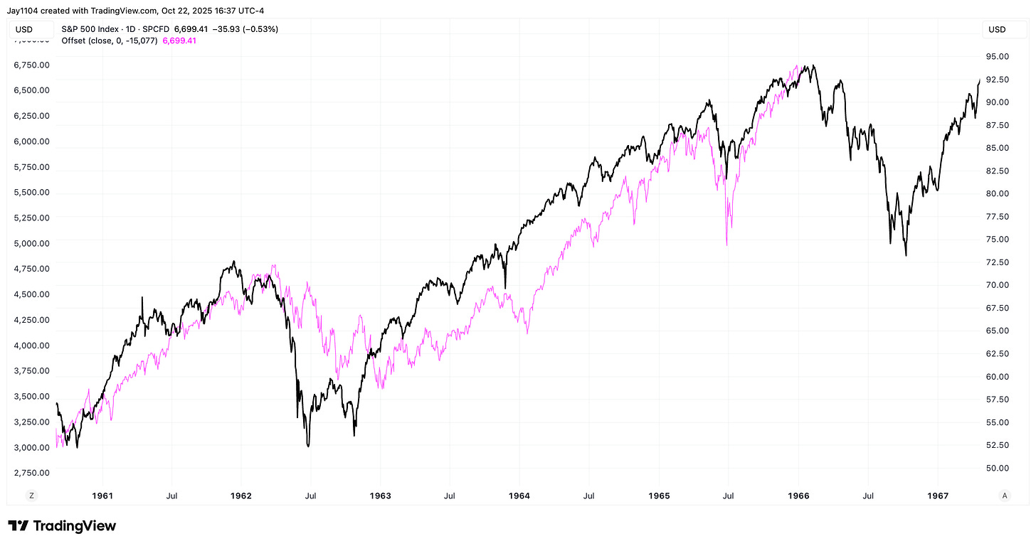 If we’re to believe the 1966 analog, the same thing happened back then, too, with a similar topping pattern and formation. So, technically, one could argue that from the market’s current position, there’s a good opportunity for a larger pullback to develop.