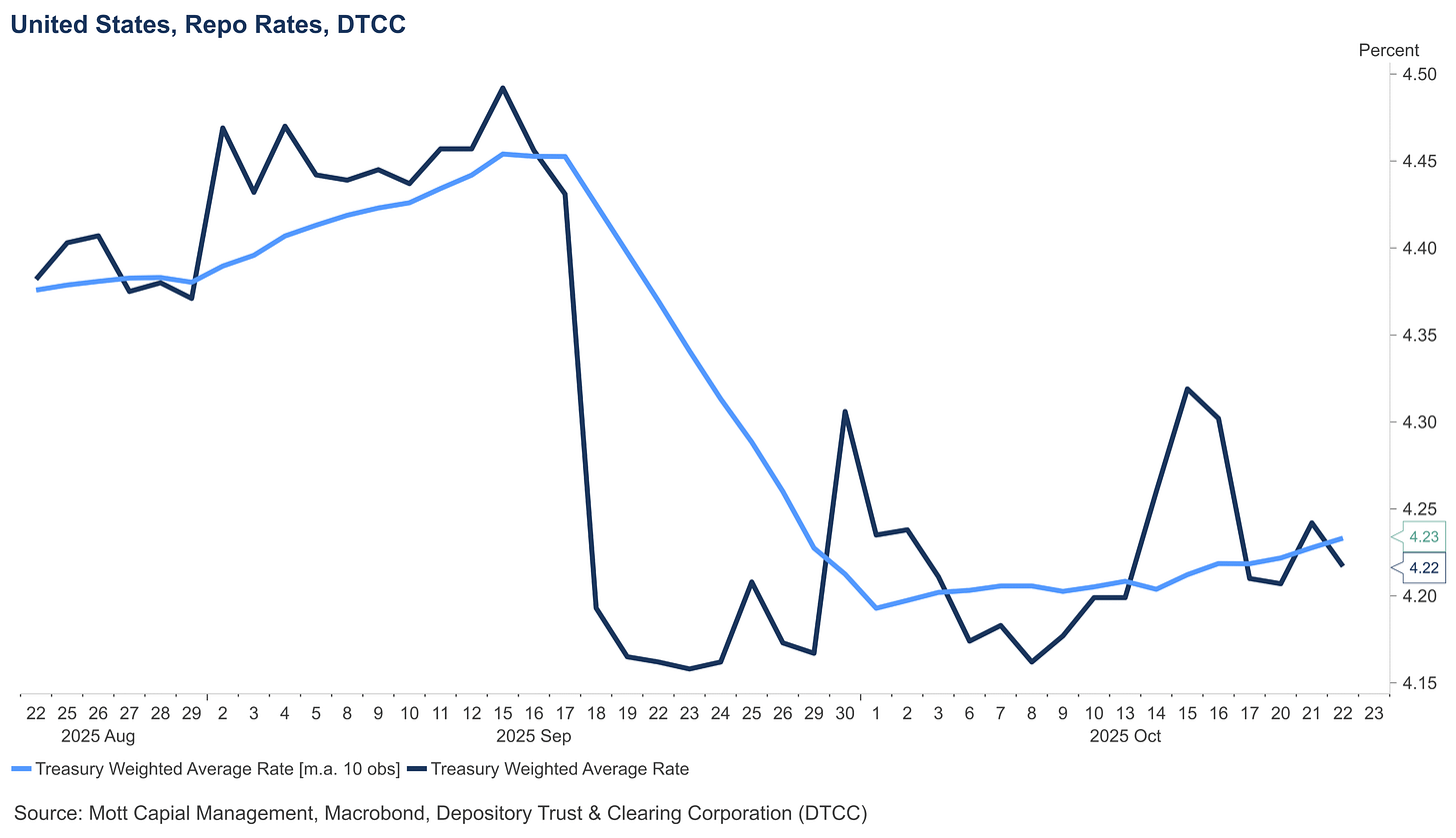 Liquidity is tight and will likely remain that way as long as the Treasury continues issuing debt and the Fed keeps contracting its balance sheet. Still, as long as conditions remain manageable and the SRF is being used, I don’t see a reason for the Fed to end QT in October — though I could see it wrapping up by December.