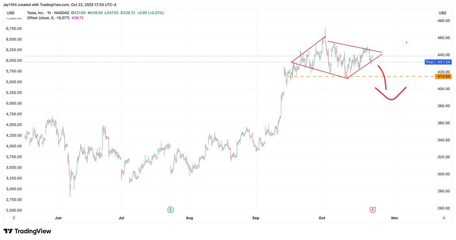 Tesla reported results today. I don’t follow the company as closely as I used to when I owned it from 2014 until early 2022, but earnings were weak while revenue was strong, suggesting a margin problem somewhere in those numbers. In any case, the options positioning was so bullish that it’s actually bearish. The key level to watch is $420 — if Tesla breaks below that, it could face a significant drop. My guess is the market is waiting for the conference call to conclude before making up its mind.