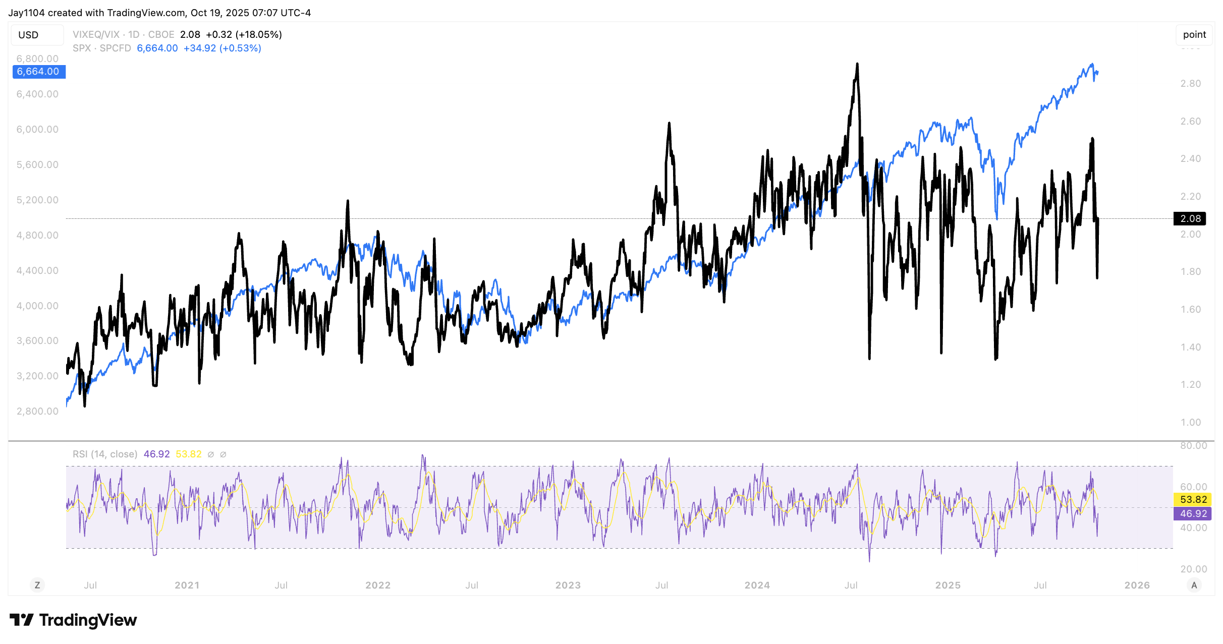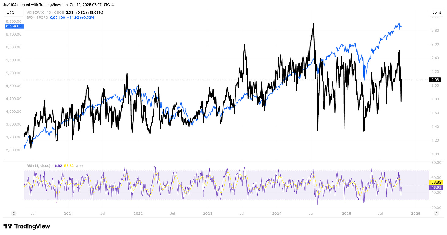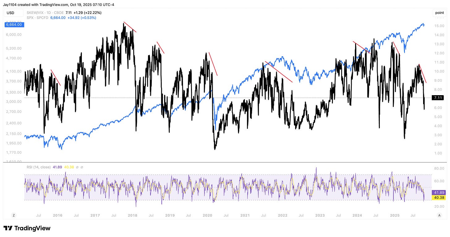 We’re also seeing the classic rotation away from out-of-the-money tail-risk hedging toward more immediate at-the-money protection, as reflected by the sharp collapse in the SKEW/VIX ratio.