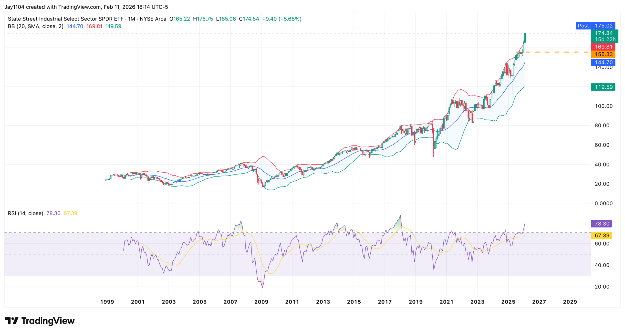The Industrials sector ETF, XLI, is now trading above its upper Bollinger Band on the monthly chart, with an RSI of 78.3. Historically, when the sector has become this stretched, it has typically led to extended periods of consolidation.