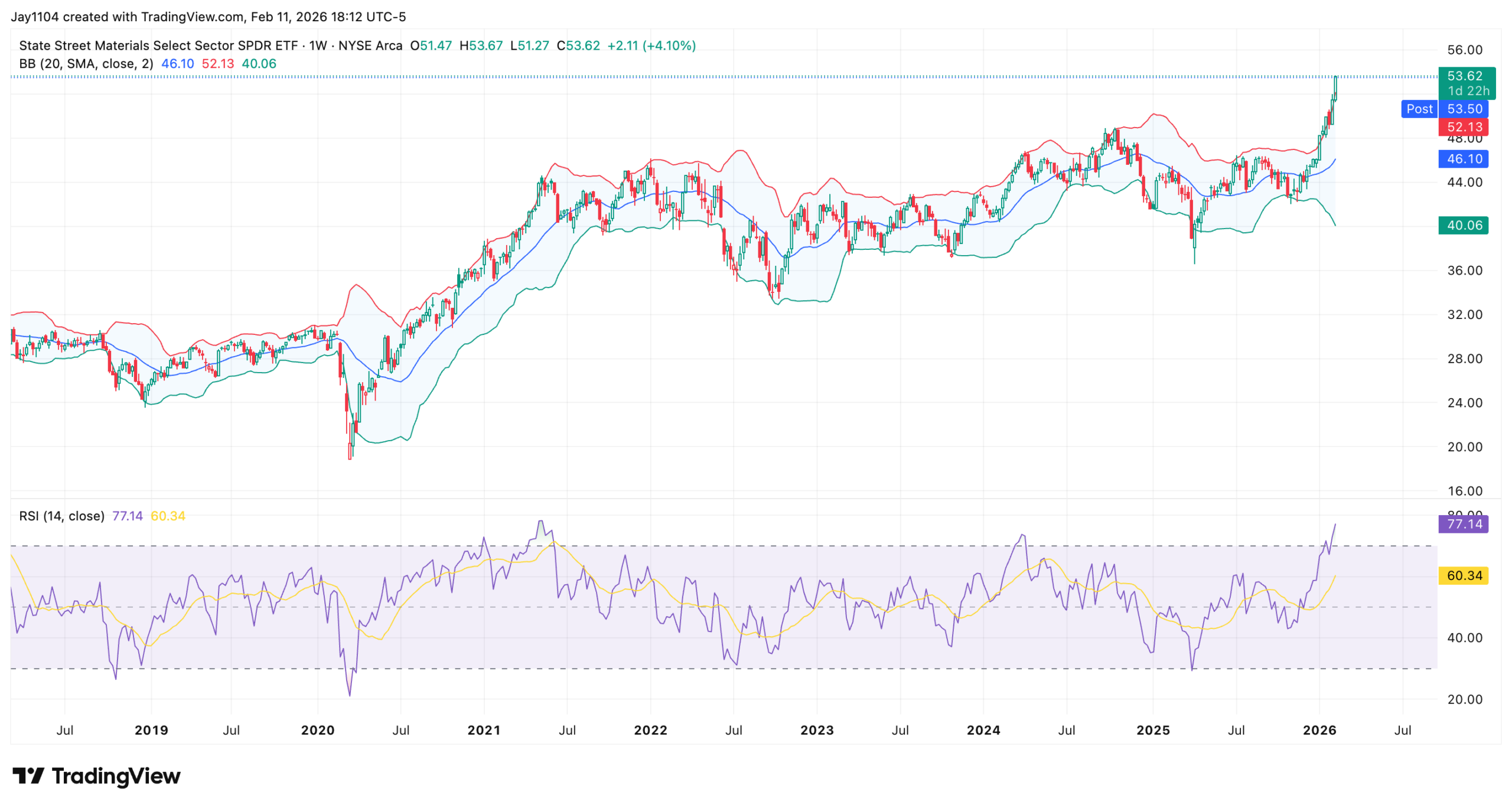 In addition, some sectors and recent moves have become extremely overextended on technical grounds. The Materials sector ETF, XLB, is now showing a weekly RSI of 77 and is trading above its upper Bollinger Band on the weekly chart. Both are classic signs of an overbought condition, suggesting the sector may be stretched in the near term.