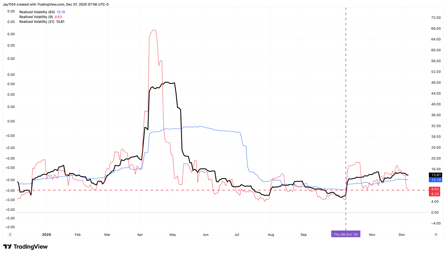 This is mainly because implied volatility has fallen sharply over the past week, leaving the market with very little apparent “juice” at the moment. Even so, realized volatility — at least the nine-day measure — also fell on Friday to 8.63. This continues to suggest that volatility is compressing, and it means that any market move larger than roughly 50 basis points is likely to push realized volatility higher again, which would in turn put upward pressure on implied volatility.