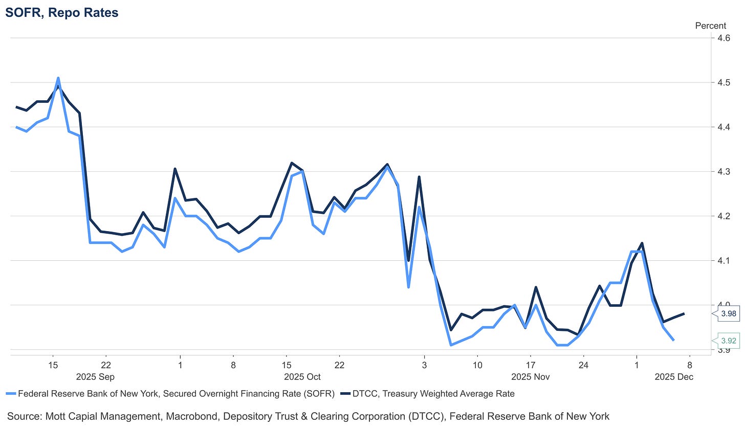 While we did see overnight funding rates ease somewhat last week — with the general collateral rate slipping to a mid-week low of 3.96% — it moved back up to around 3.98% on December 5, suggesting that SOFR is likely to resume rising. This is important because, despite two Treasury paydowns last week, we haven’t seen general collateral rates decline further. We’ll get two more paydowns this week, but that dynamic will change on the 15th, when roughly $80 billion in Treasury settlements are expected.