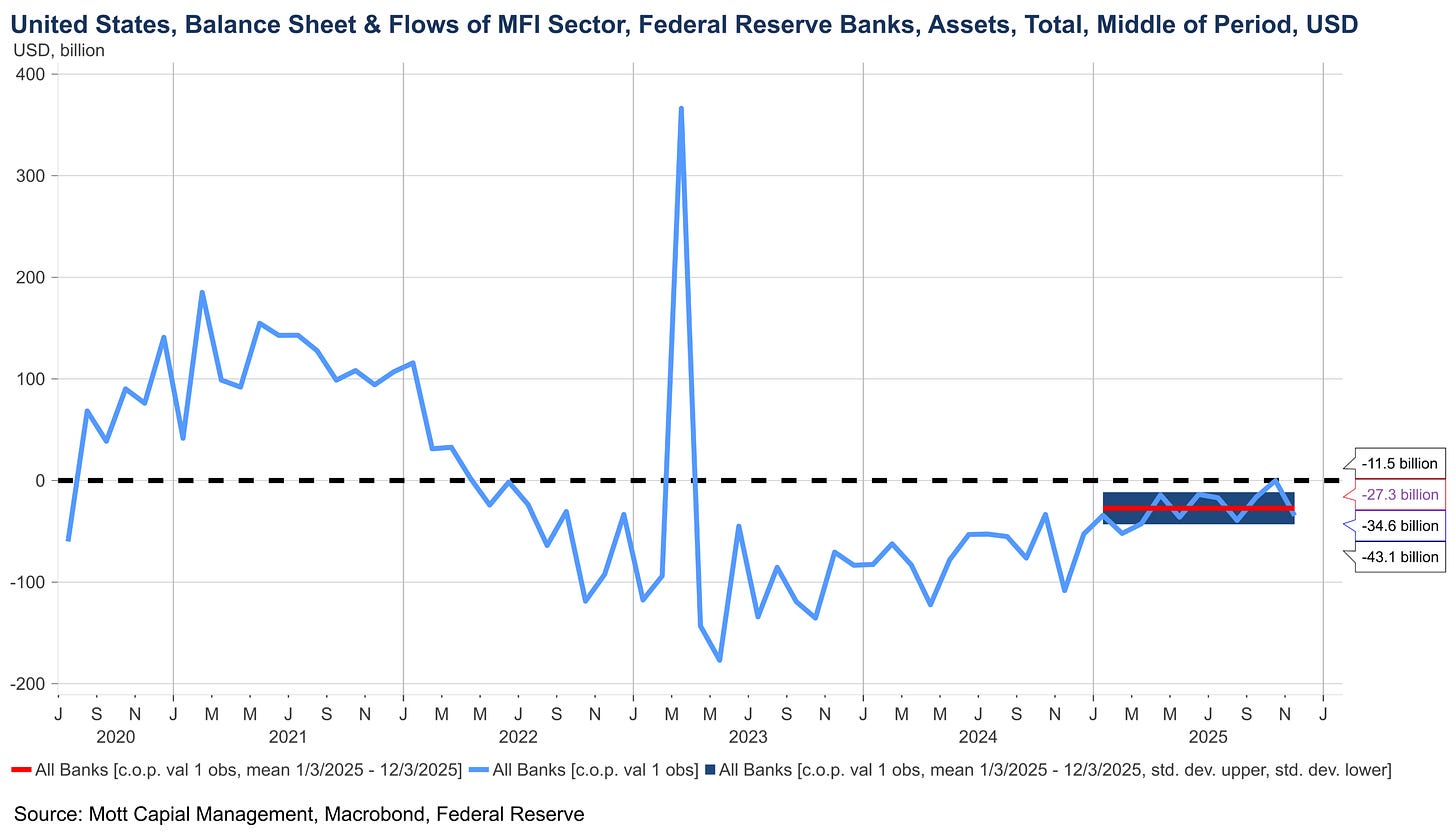 By my estimate, over the past year, the Fed has averaged roughly $30 billion per month in asset declines, with a range of about $11 billion to $40 billion. This suggests the Fed will begin reinvesting on the order of $30 to $35 billion per month. But all this would do is keep the asset side of the balance sheet neutral and prevent further declines in assets. It would not represent outright QE, which is the expansion of the assets. These would be reinvestments of maturing securities—not net new purchases intended to expand the balance sheet.