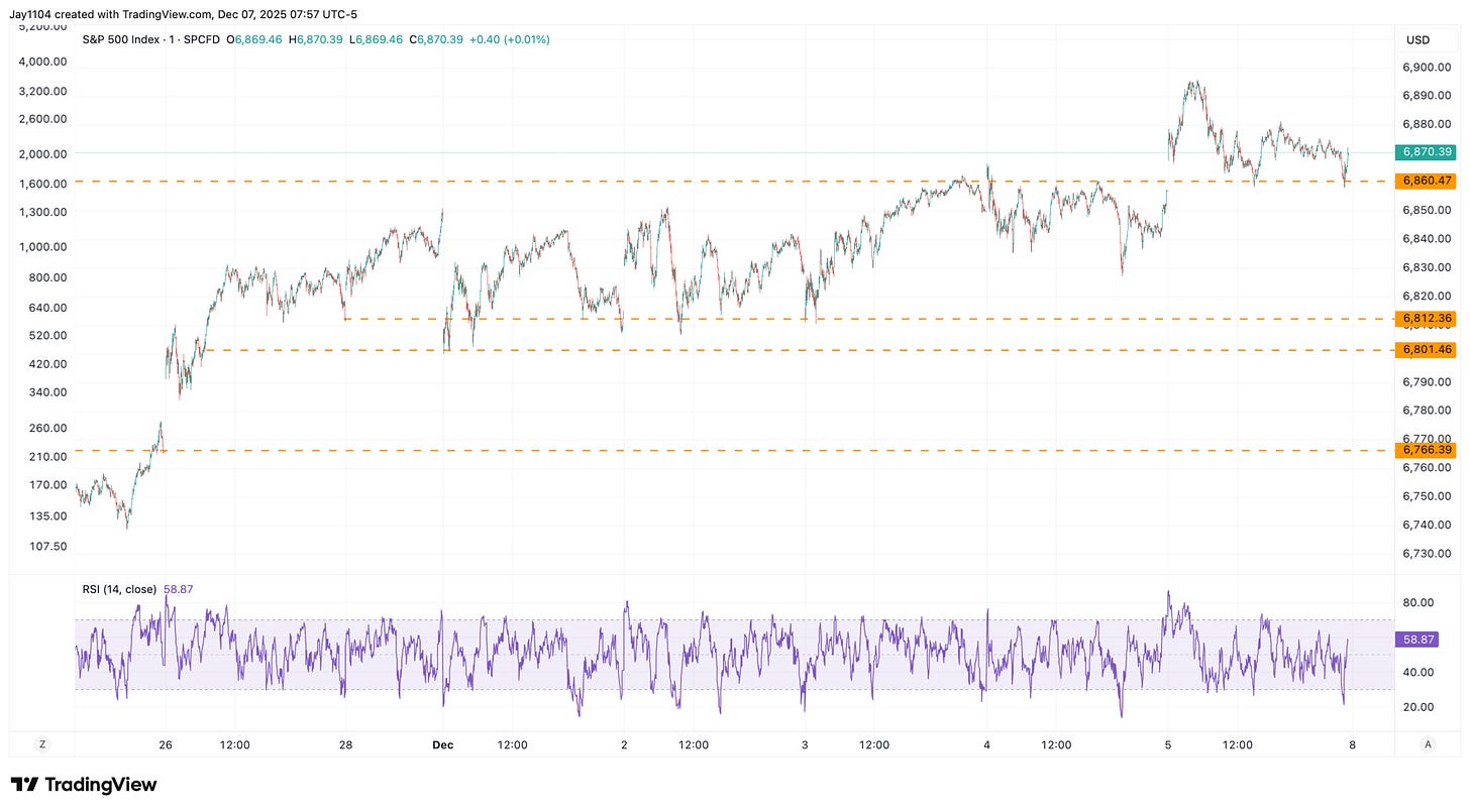 The S&P 500 rose by about 20 basis points on Friday, finishing around 6,870. The index has really been struggling over the past week to break out of its current trading range. Although it made a decent attempt on Friday, it still couldn’t push much beyond the 6,850-6,860 range we’ve identified as resistance.
