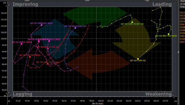 Stocks finished a bit higher today, as energy prices roses, and the XLE rose 1.7%. Additionally, the rotations back in the banks continued, with the XLF up about 90 bps. Overall, we see improvements in cyclical stocks as communication and technology names fade.
