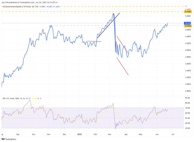The 2-yr closed at its highest rate since Mid-March today, rising to 4.79%. This certainly looks like a break out on the 2-year, but we will want confirmation of such tomorrow with the rate pushing even higher, which could eventually lead to a rise back to the March highs.