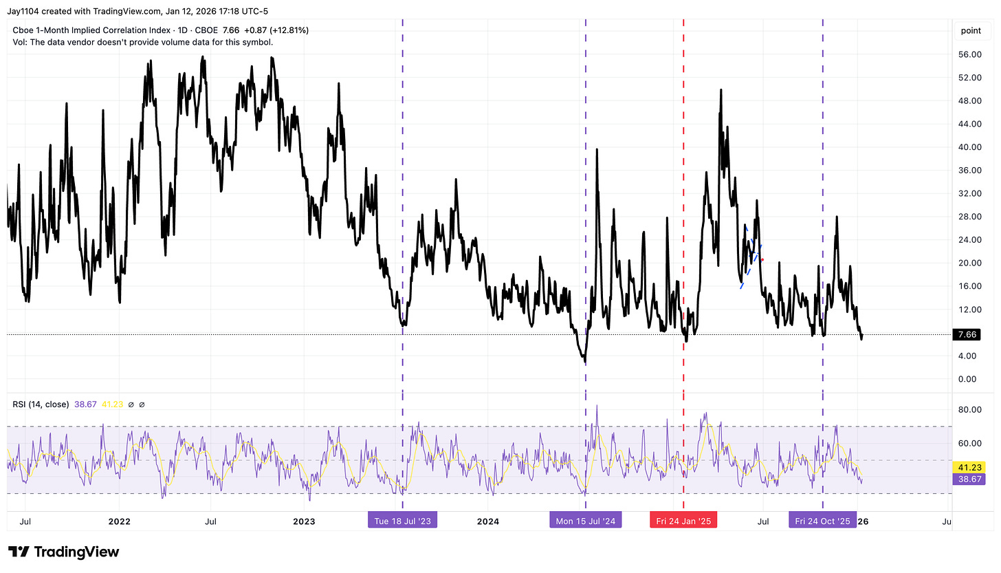 The market can continue to grind higher by 10, 20, or even 30 basis points, but given how low both realized and implied volatility are, combined with one-month implied correlation sitting at 7, good luck. It might as well have been December 22, given how little volume traded in S&P 500 futures today.