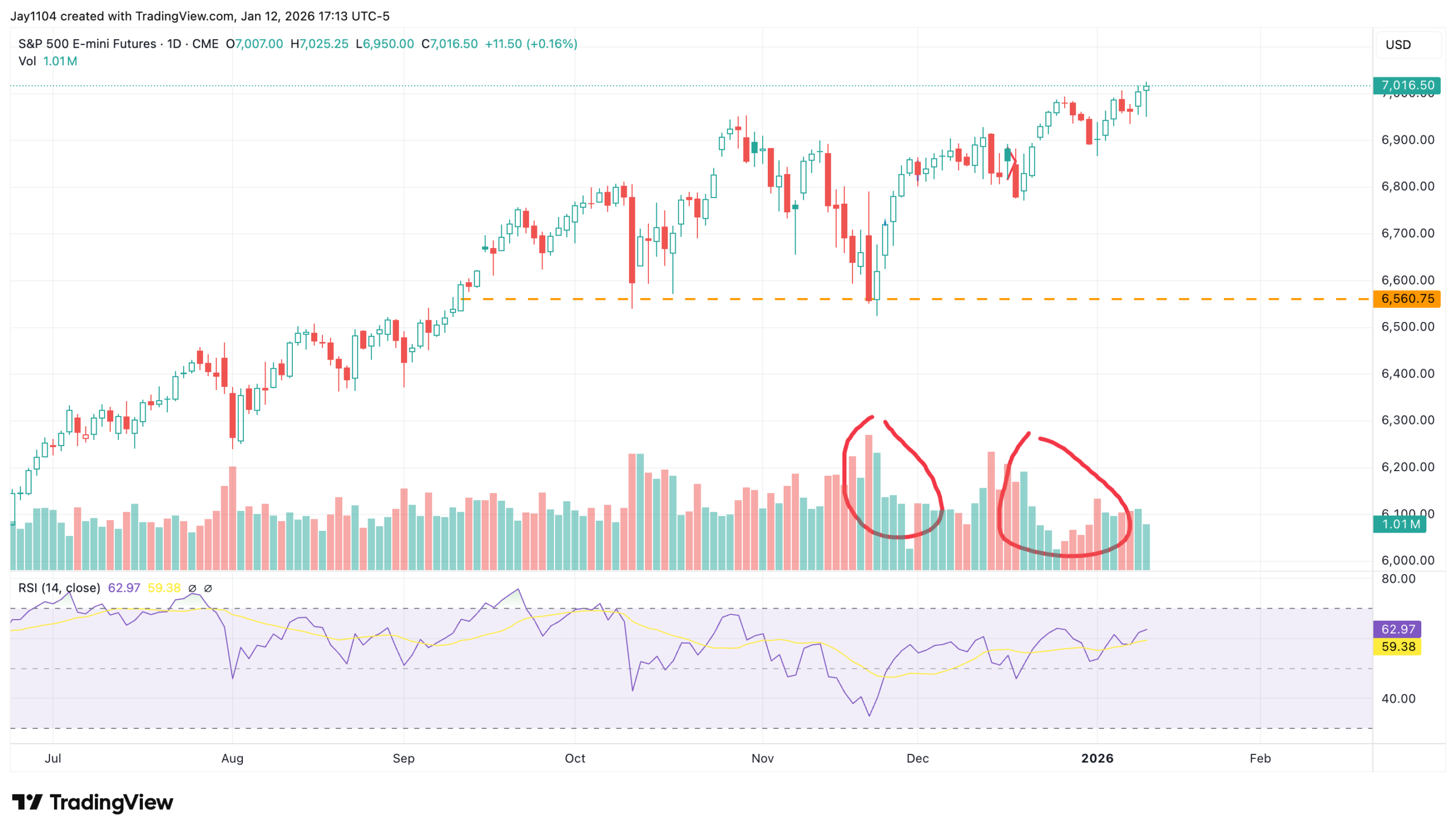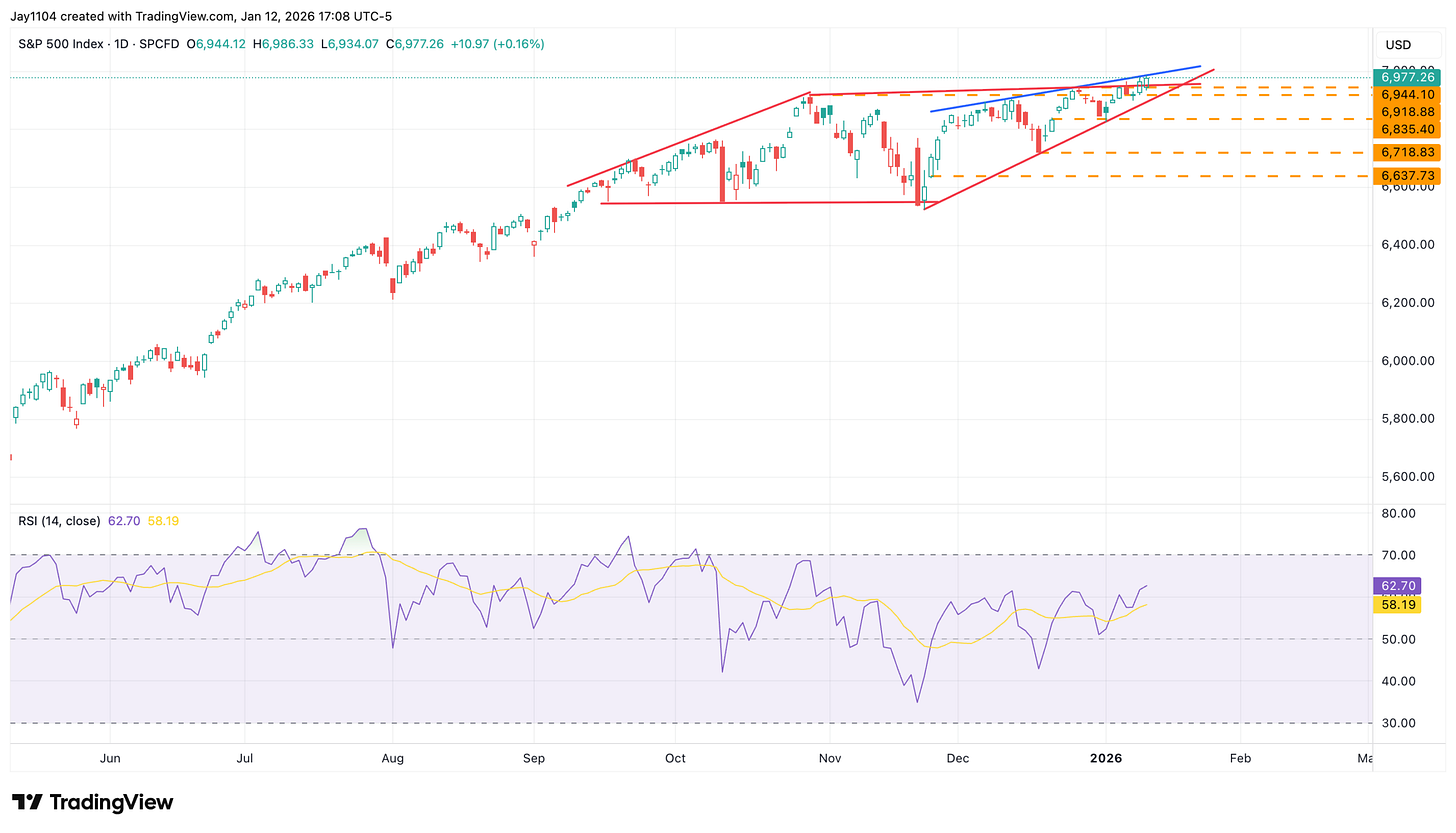 The S&P 500 looks fine at this point, but I certainly do not think this is the major breakout that so many have been dreaming about since the end of October. As it stands, the index is not even trading a full bar above resistance at the trendline. We saw similar behaviour at the start of both 2022 and 2025.