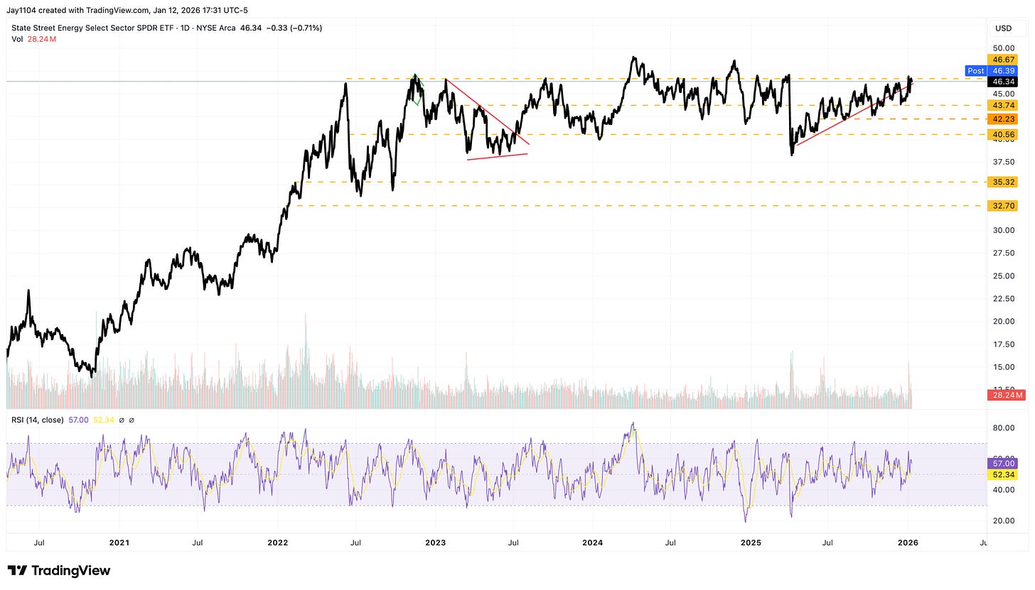 It is also somewhat interesting that, despite all of the problems facing oil over the past four years, XLE has never really broken down. Instead, it has largely moved sideways throughout that entire period. One would imagine that if oil were ever to break out decisively and begin rising, it could prove quite bullish for the sector. XLE now appears to be sitting at a very important resistance level and is probably worth watching closely.