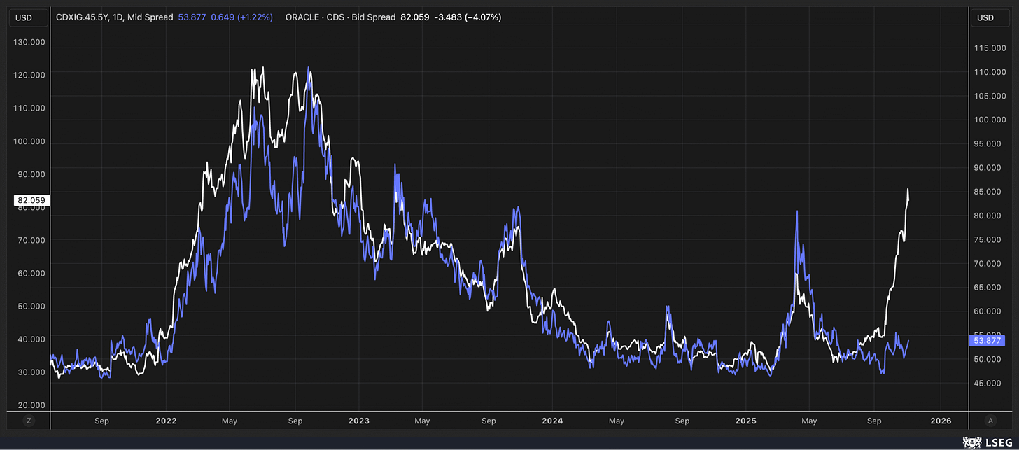 The investment-grade CDX spread index widened again today. It’s been trending wider for the past few sessions, though it remains relatively low at around 54. Still, it appears to be moving higher, which would make sense—particularly if we continue to see credit spreads like Oracle’s widen the way they have. If that trend persists, it stands to reason that other investment-grade credit spreads will also begin to widen.