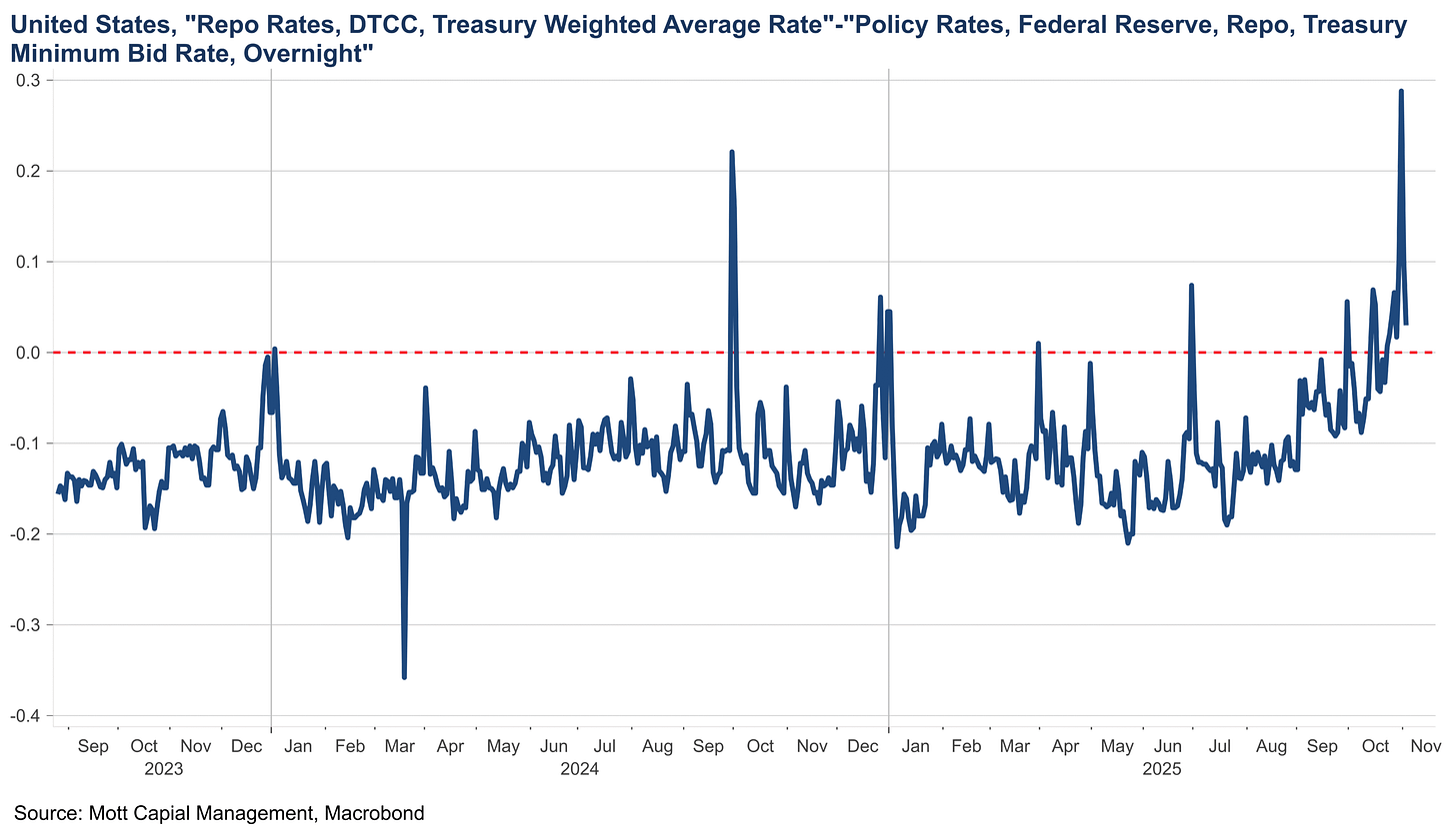 We’ve seen overnight funding pressures ease since month-end, but liquidity conditions remain extremely tight, with little sign of improvement anytime soon—unless the Fed were to expand its balance sheet again, which seems highly unlikely.