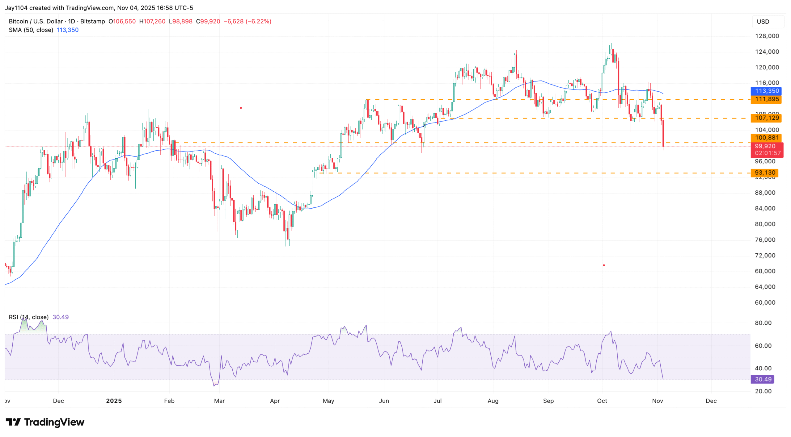 Bitcoin, which I think of primarily as a liquidity gauge, was hammered today, dropping as much as 7% at one point and currently trading down about 6.5%. It broke through significant support around 101,000, and the big question now is whether it’s headed toward 93,000.
