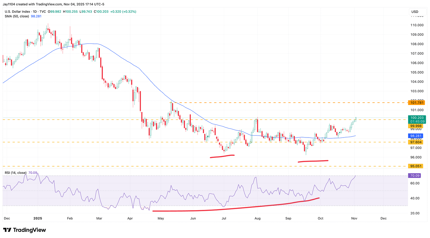 The dollar continued to show signs of strength today ahead of tomorrow’s ADP jobs report. The dollar index rose to 100.2, breaking above what appears to be the neckline of a double-bottom pattern that has been forming over the past six months. This breakout suggests the dollar index could be on its way toward the 102 level.