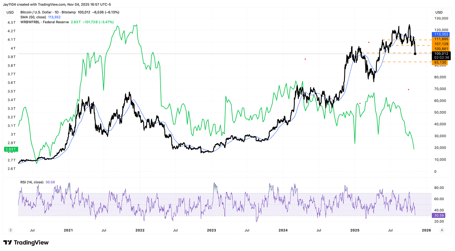 There aren’t many asset classes that trade more directly in line with liquidity than Bitcoin. Historically, there’s been a clear relationship between reserve balances and Bitcoin’s performance, and it looks to me like we’re now starting to see the effects of that tightening show up in full force.