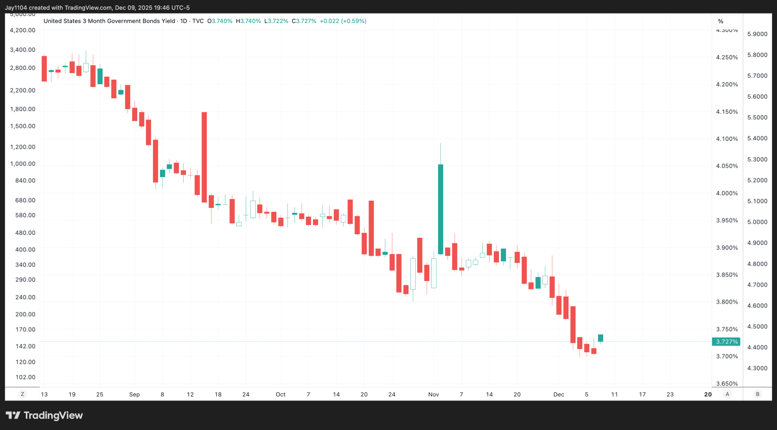 If the Fed is about to restart QE — as I’ve been reading non-stop on social media over the past week — the three-month Treasury has a strange way of showing any nervousness or excitement about it. In fact, the three-month Treasury rate rose by two basis points today to 3.73%. That’s not exactly what you would expect ahead, an asset-purchase program designed to expand the Fed’s balance sheet. I would expect rates to be moving lower in anticipation of such a program, but we’re seeing the opposite. That tells us the market is not pricing in an expansion of the Fed’s balance sheet at the December meeting.