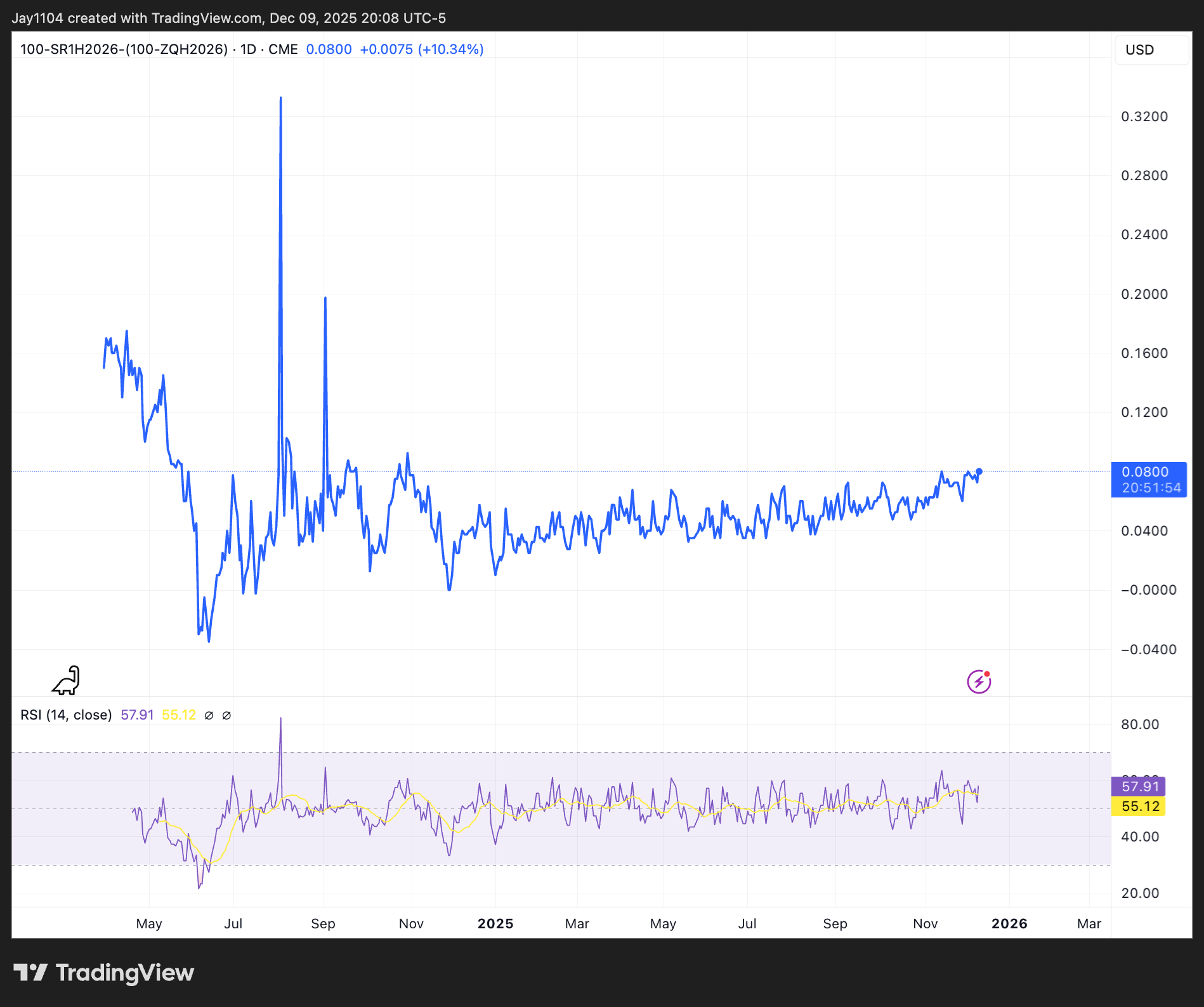 Also, when we look at the SOFR—specifically the March 1-month SOFR futures spread against Fed Funds—we see the spread widening to roughly +8 basis points. This implies the market expects SOFR to trade above the policy rate, reflecting tight conditions to persist; this is the opposite of a QE signal, suggesting overnight funding conditions will remain tight for some time longer.