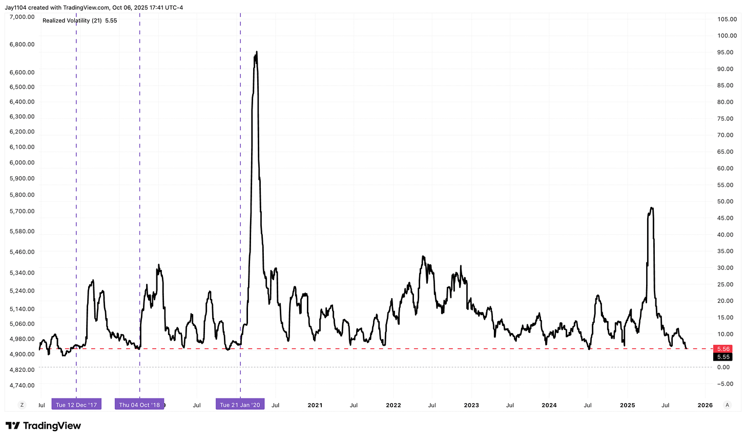 The issue, of course, is that the S&P 500’s 21-day realized volatility is just 5.55, which means the index can’t rise or fall by more than about 35 bps per day without pushing realized volatility higher.