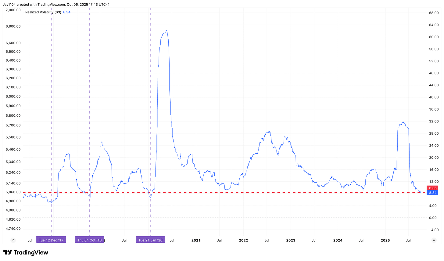 Meanwhile, the 3-month realized volatility is at 8.3, which means the S&P 500 can’t move up or down by more than about 52 bps per day without causing realized volatility to rise.