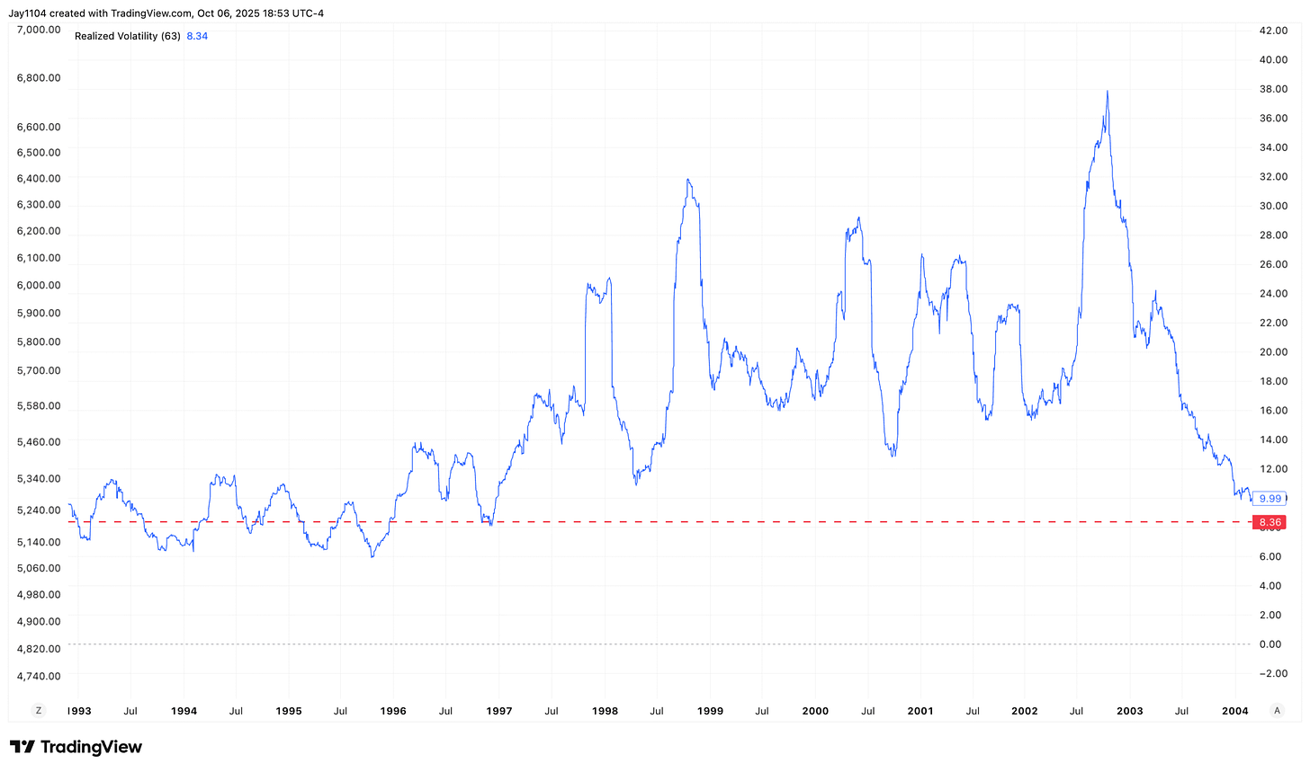 Three-month realized volatility was also significantly higher. The red dotted line marks where three-month realized volatility stands today. From both a realized and implied volatility standpoint, volatility was much higher in the late 1999 and early 2000 period. Today, it’s suppressed. A different type of trade is driving the market higher now compared to the year 2000.