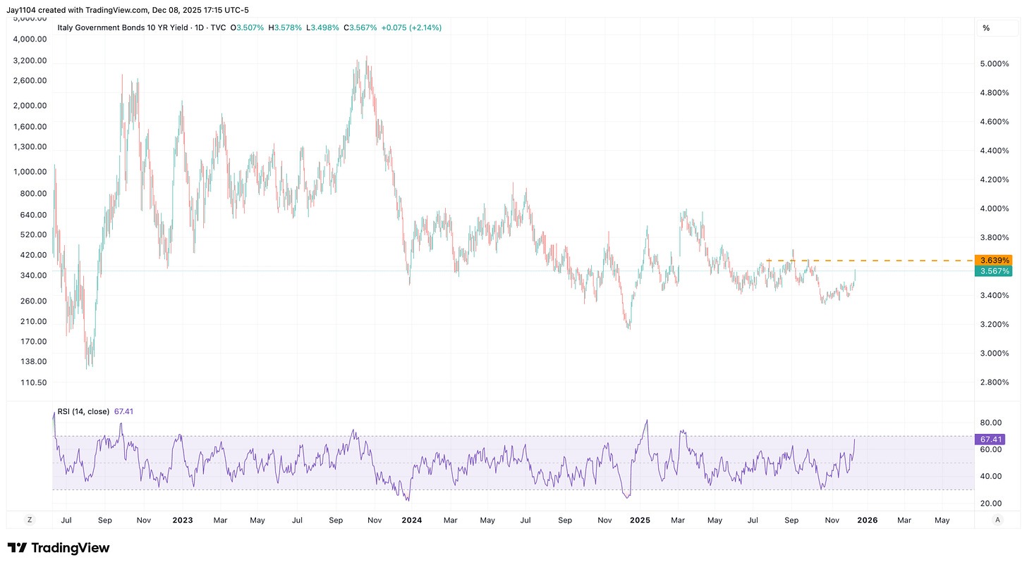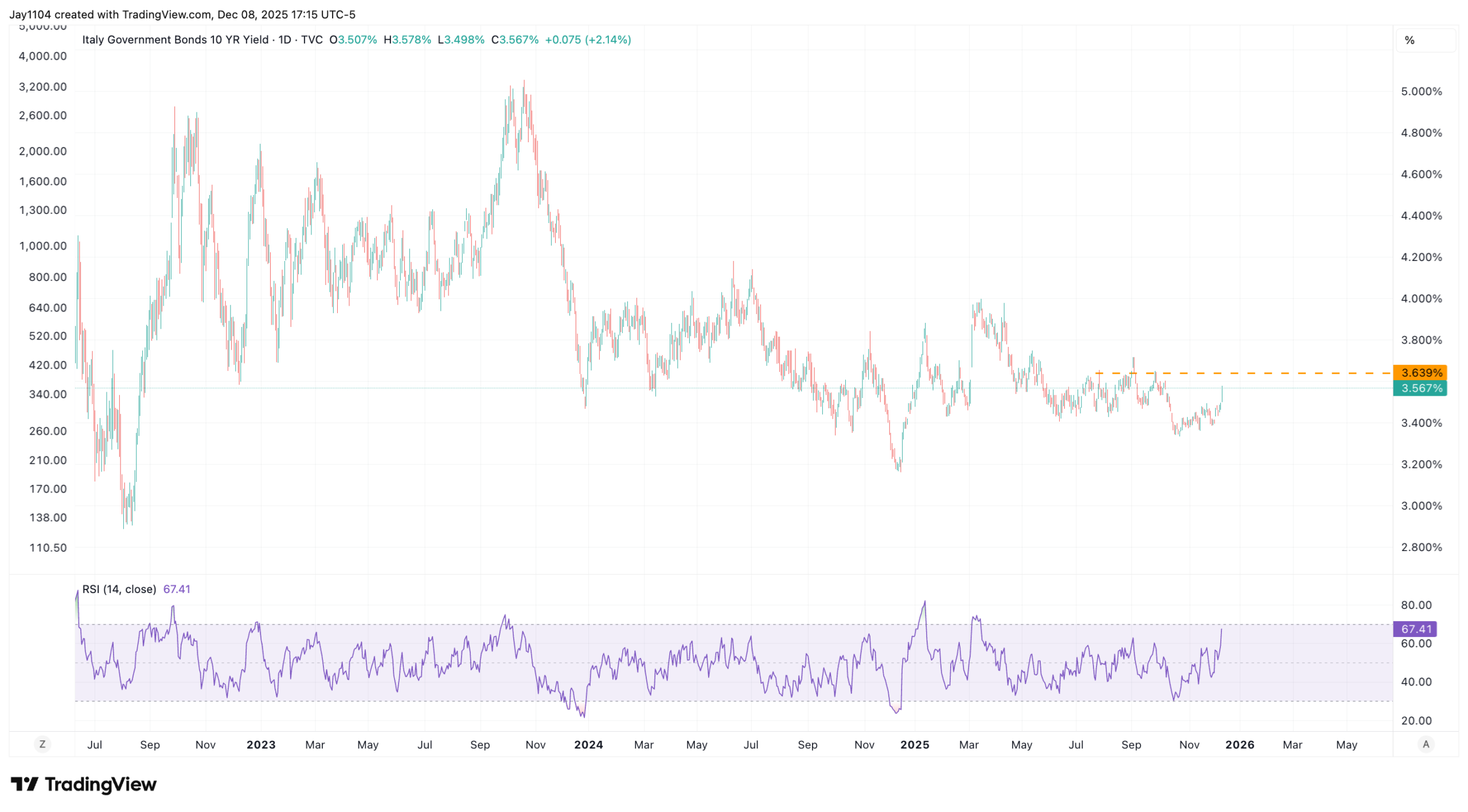 It also seems like a good time to keep an eye on the Italian 10-year, which rose by almost 7.5 basis points today. If it moves above roughly 3.65%, the technical chart suggests it could be on its way toward 4%.