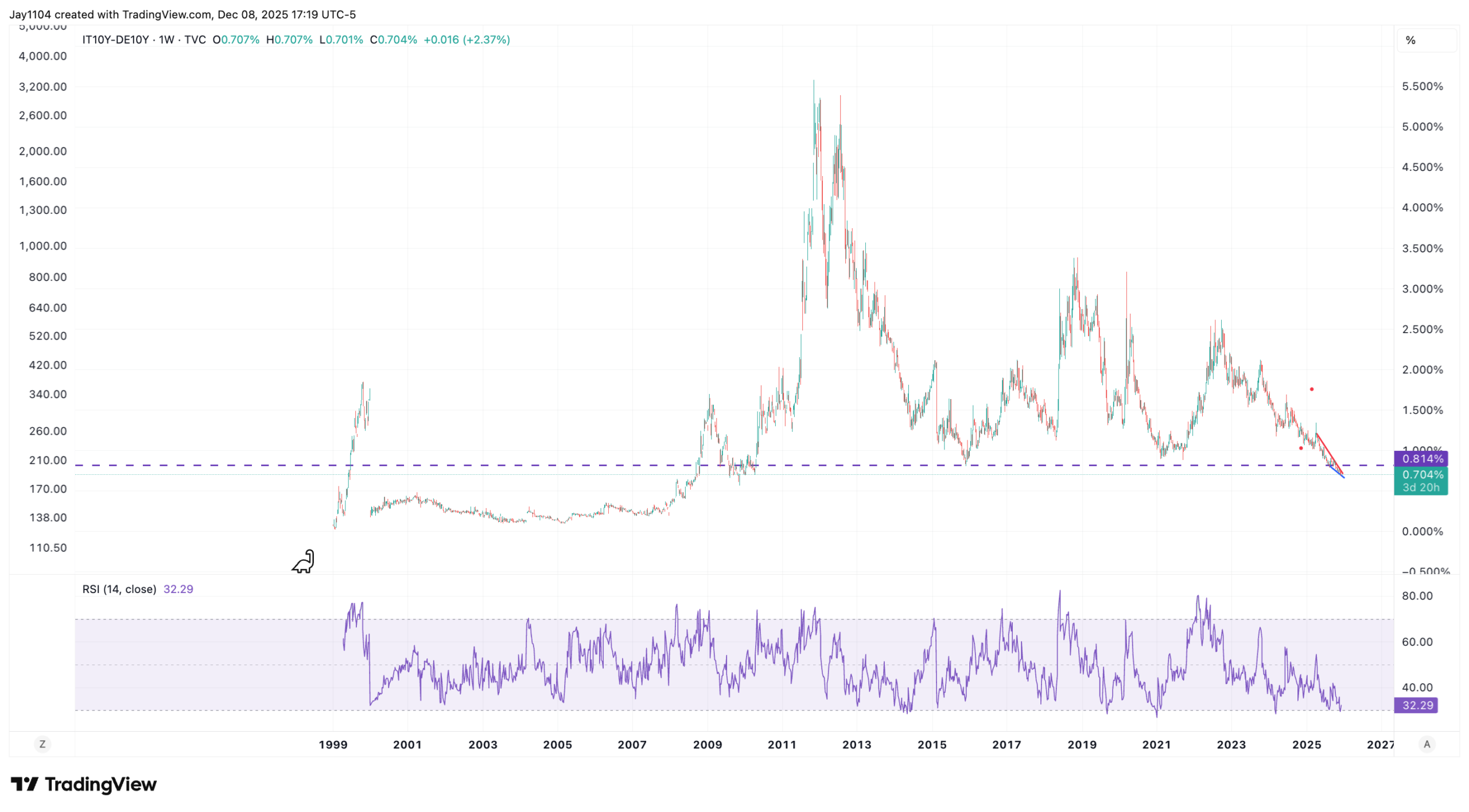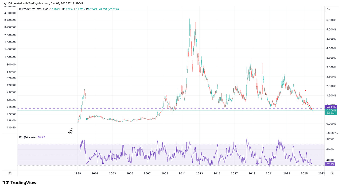 It also seems like a good time to watch the spread between Italian and German 10-year yields, which has narrowed to its lowest level in decades. If Italian 10-year rates begin to move higher, that spread could start widening again — a development that would generally signal a risk-off environment for credit spreads globally.