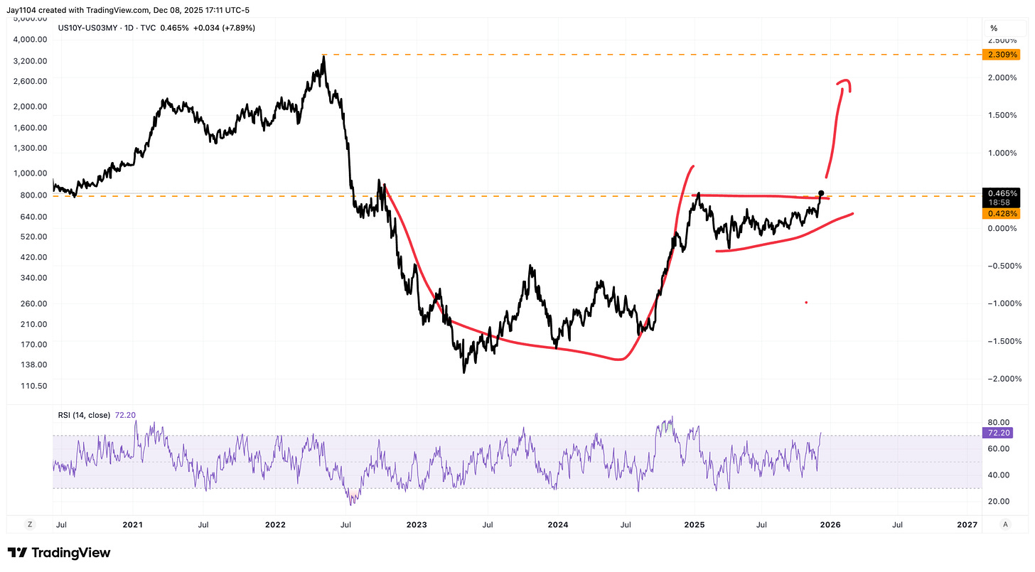 The spread between the 10-year Treasury and the 3-month Treasury bill rose by another 3.5 basis points today, reaching 47 basis points. One could argue that this spread is forming a large cup-and-handle pattern, which would suggest that a breakout above roughly 42 basis points could allow it to move substantially higher — potentially toward 2%.