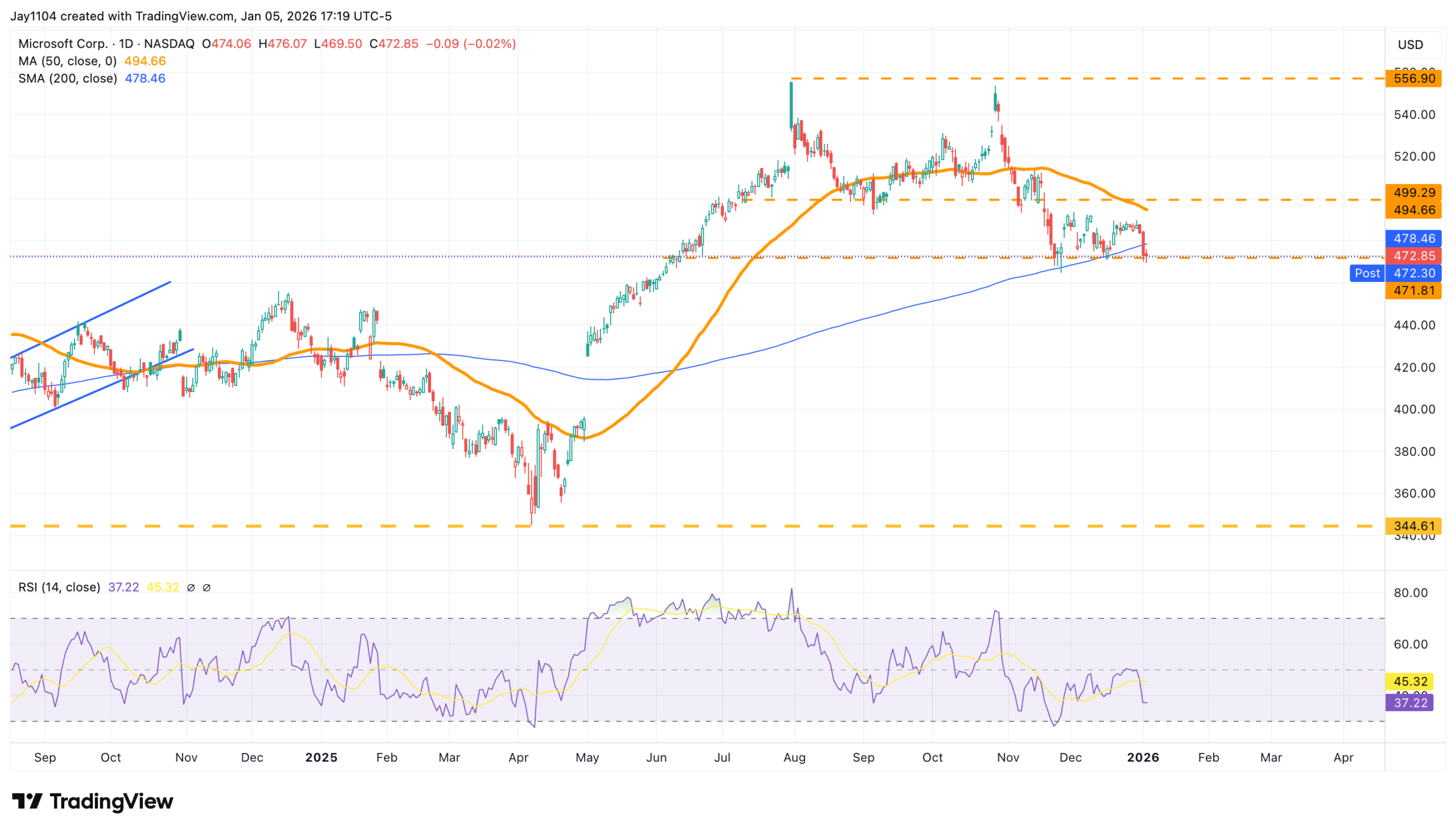 Microsoft, on the other hand, has been trading below its 50-day moving average for some time and is now also below its 200-day moving average. Support around $470 appears to be pretty important as well.